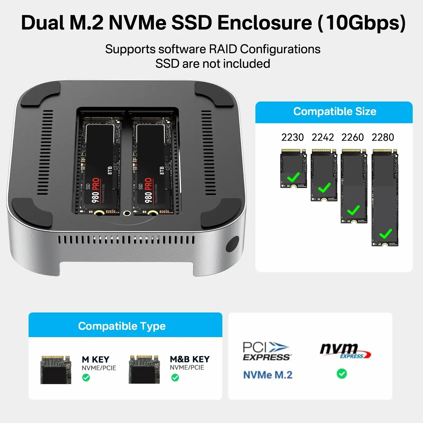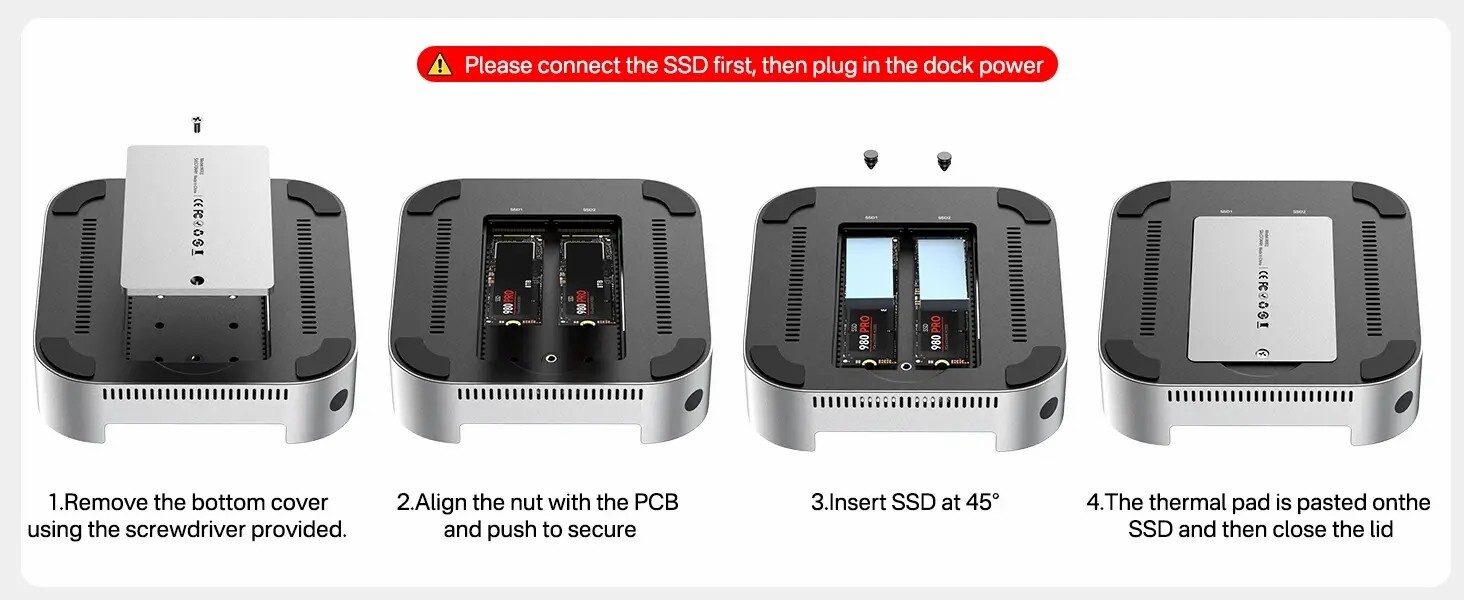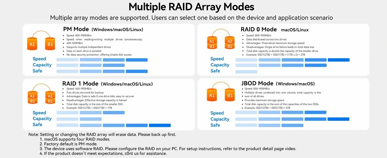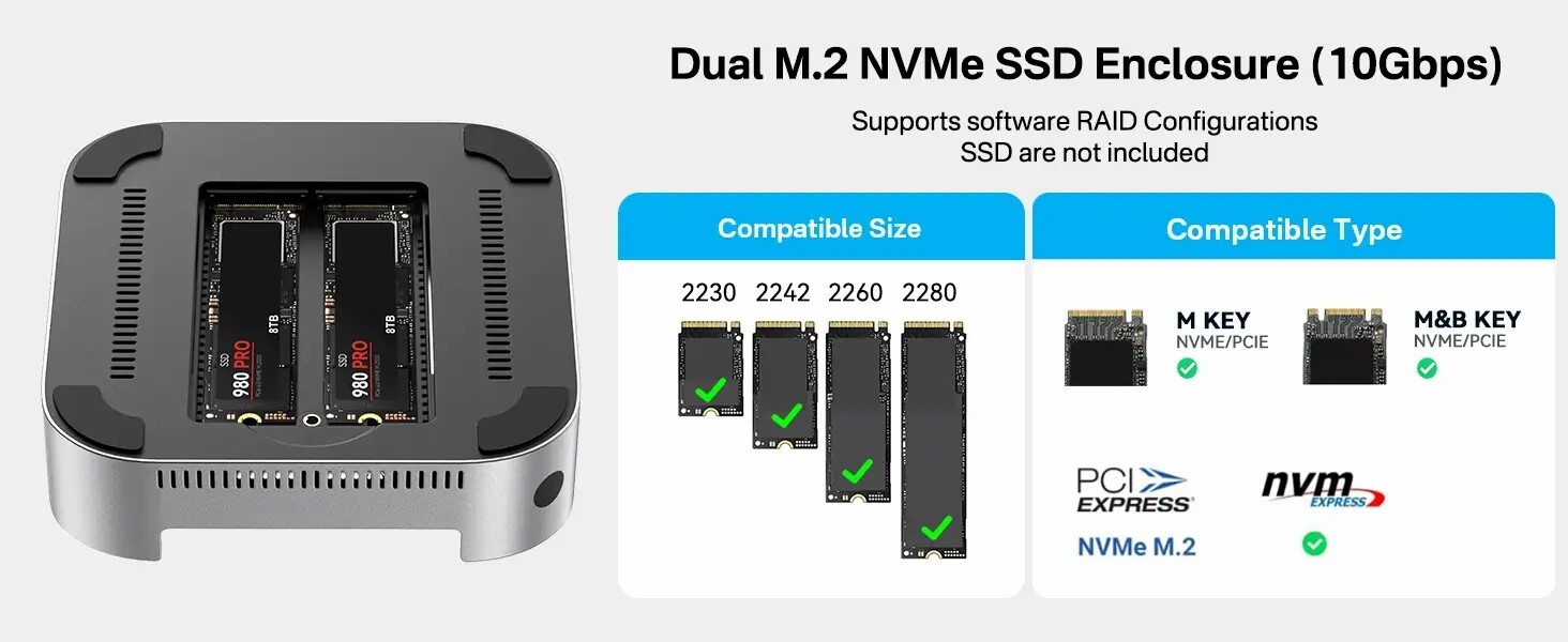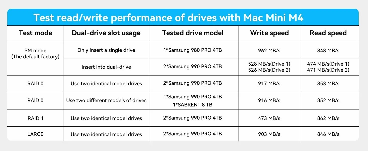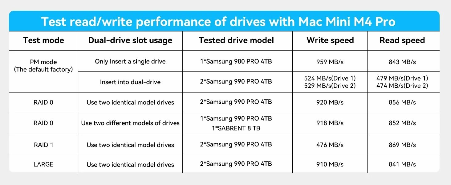 可擴充至16TB儲存:支援兩個 NVMe SSD,在 RAID 0 模式下可達 16TB,速度917MB/s,其他模式下可達 8TB,速度474MB/s,專為擴展 Mac Mini 儲存設計。