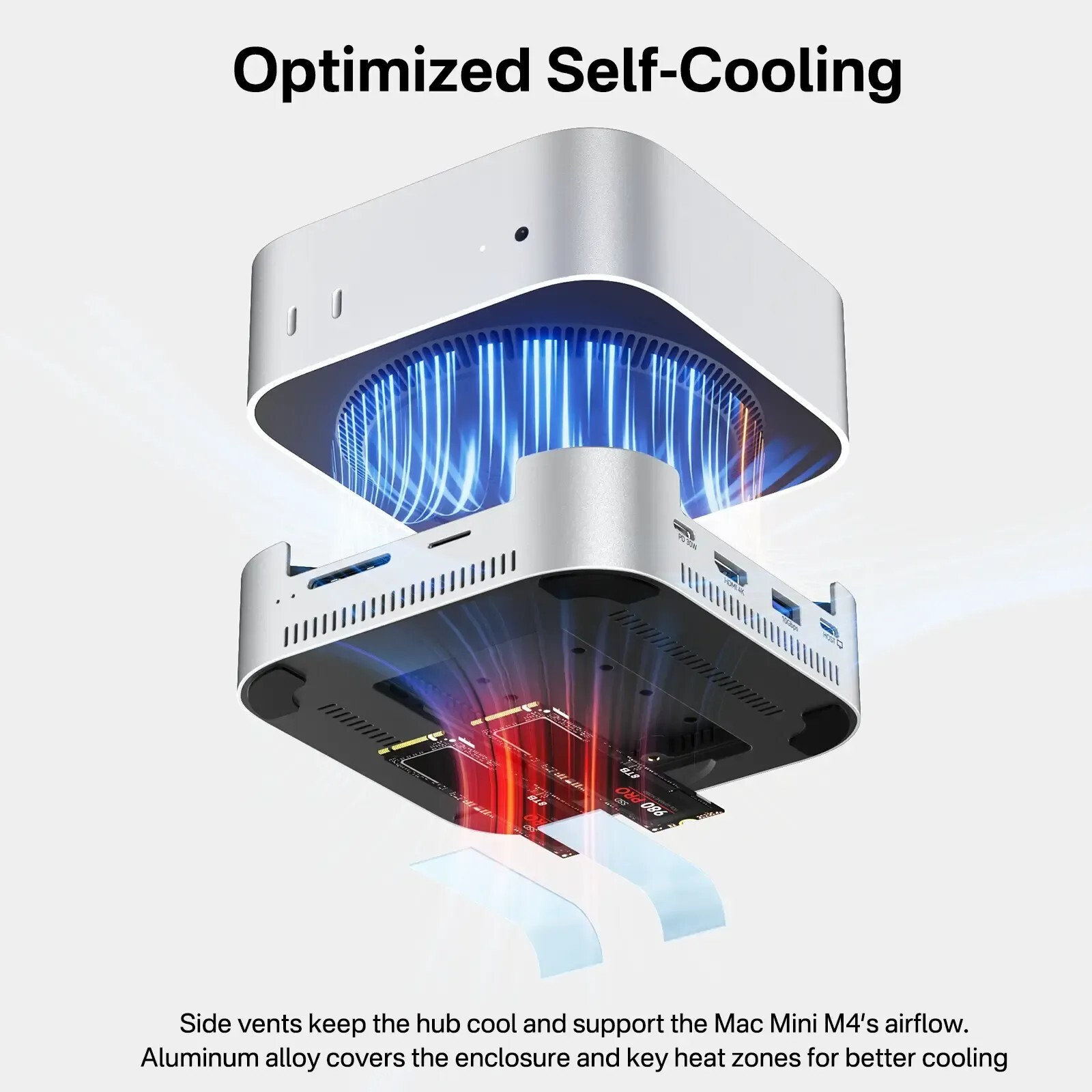 高效散熱設計:採用鋁合金製造,側面通風孔優化散熱,兩個靜音風扇自動啟動,運行後維持安全的 60°C。