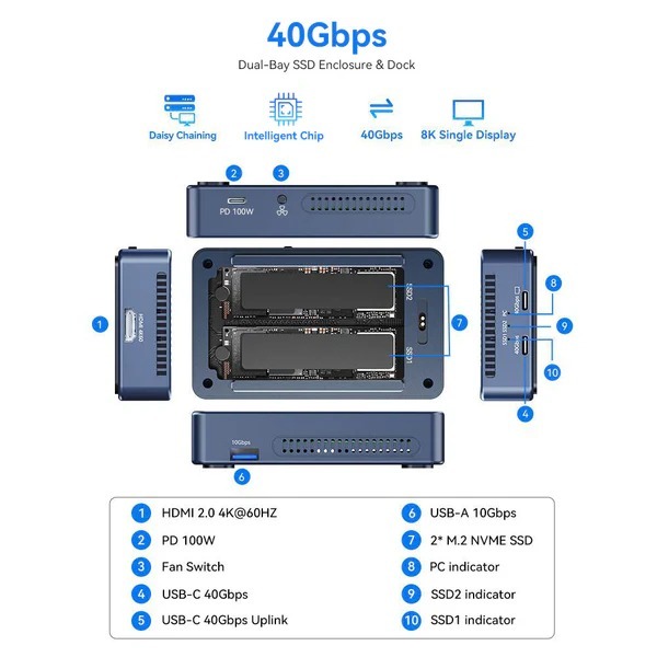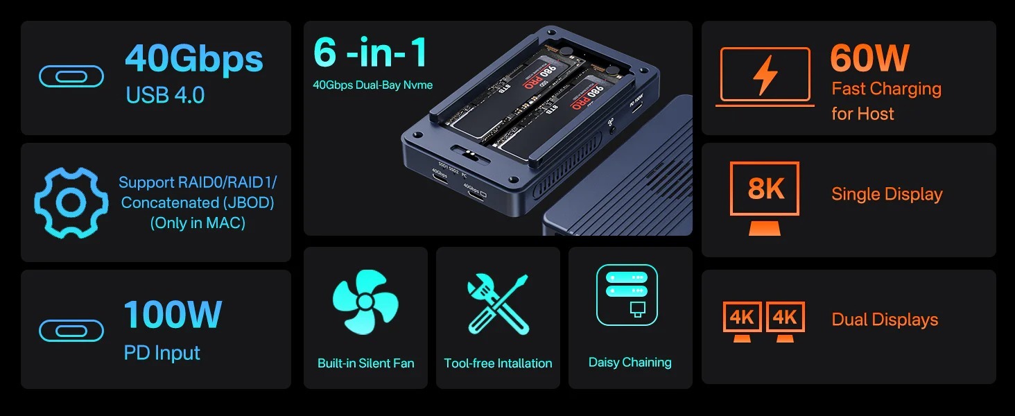 ACASIS TBU405ProMax 40Gbps M.2 NVMe 2 Bay RAID SSD 插座兼容 Thunderbolt 4/3 USB 擴充盒