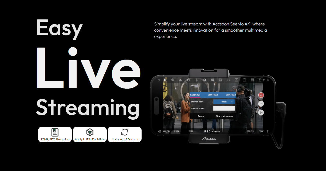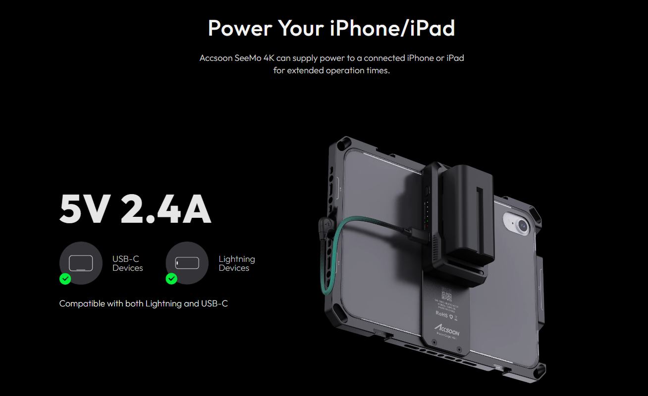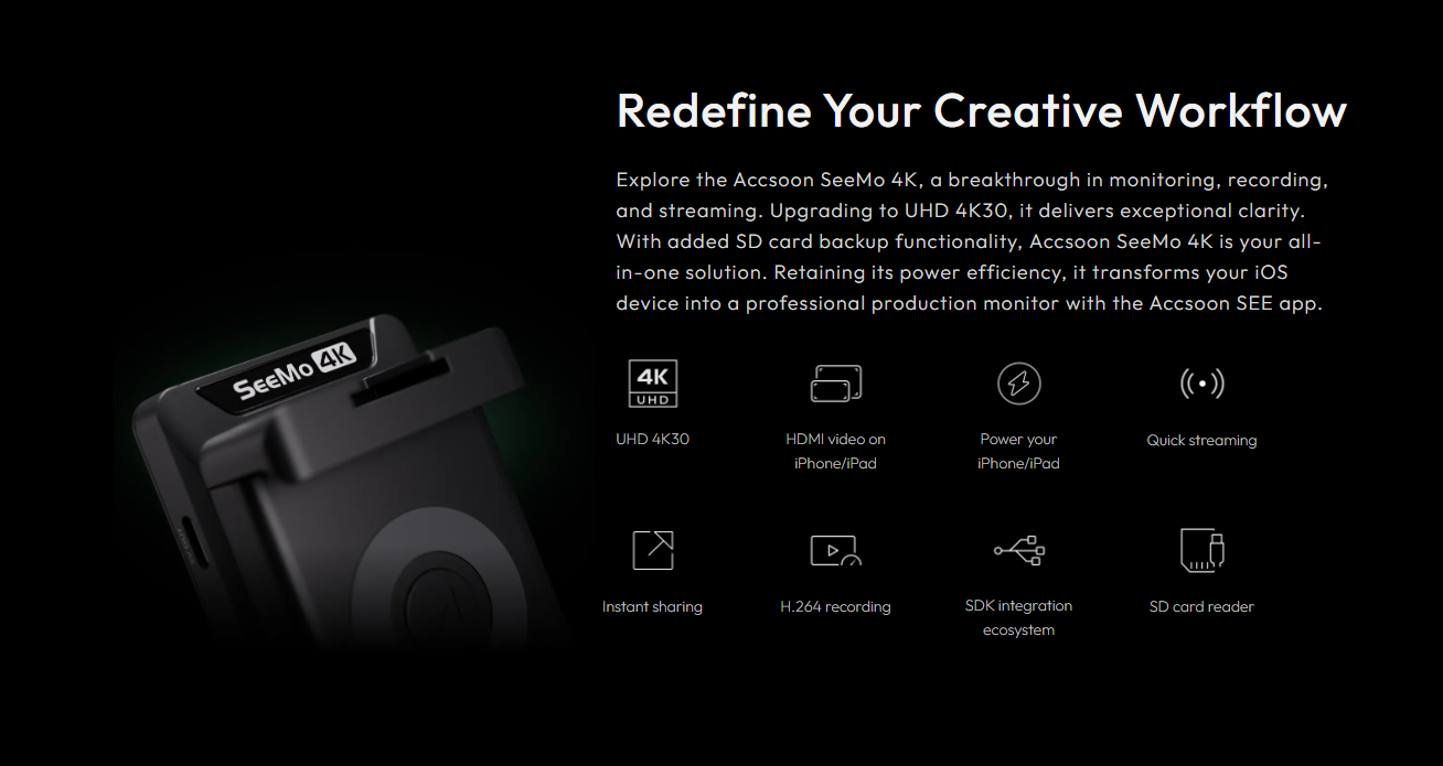 Explore the Accsoon SeeMo 4K, a breakthrough in monitoring, recording, and streaming. Upgrading to UHD 4K30, it delivers exceptional clarity. With added SD card backup functionality, Accsoon SeeMo 4K is your all-in-one solution. Retaining its power efficiency, it transforms your iOS device into a professional production monitor with the Accsoon SEE app.