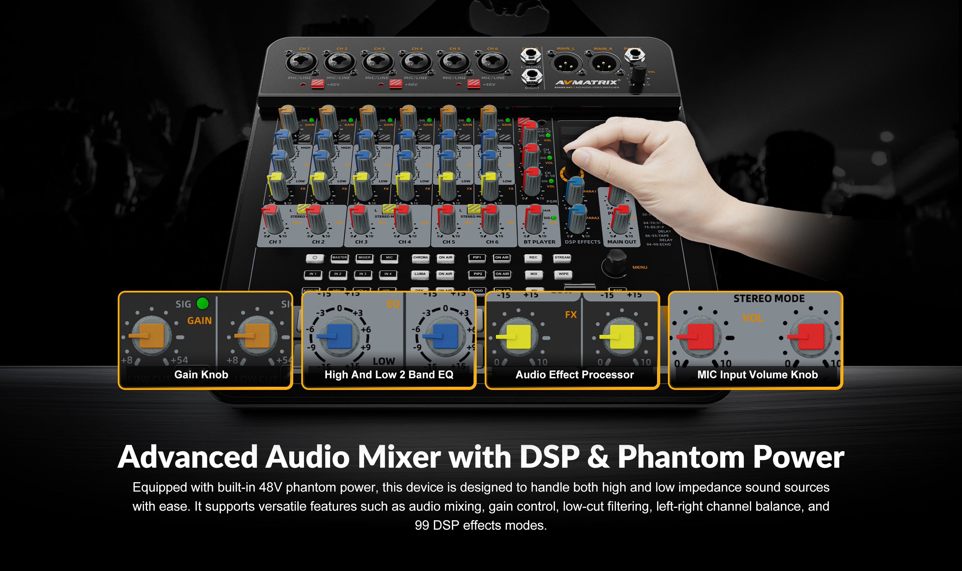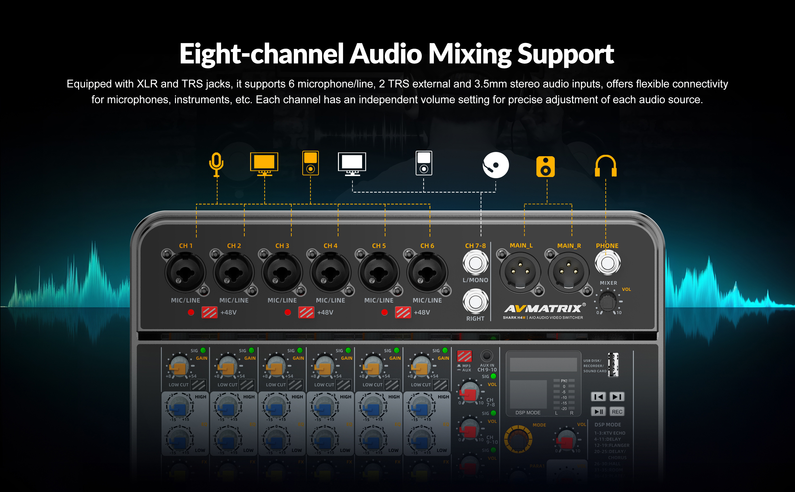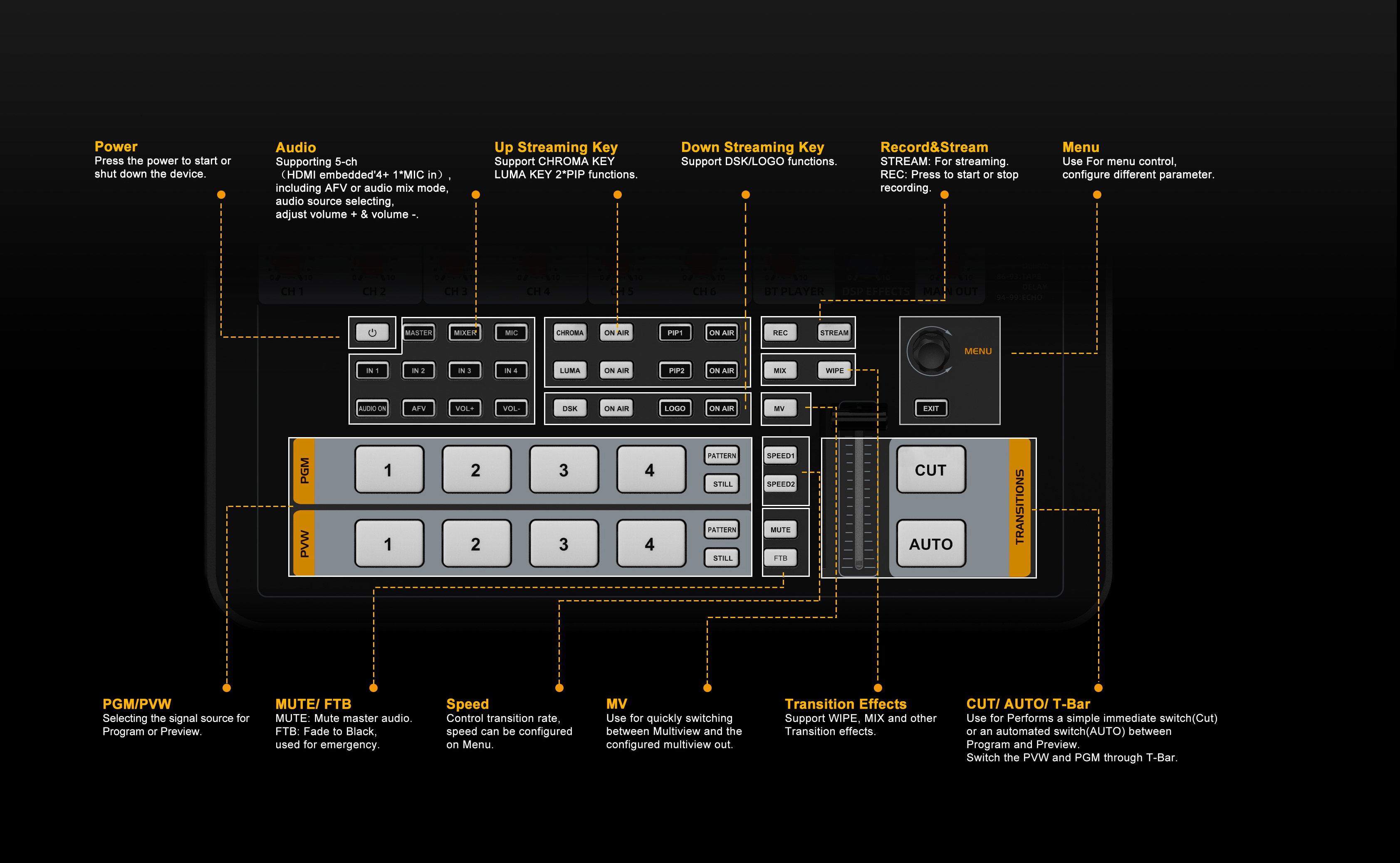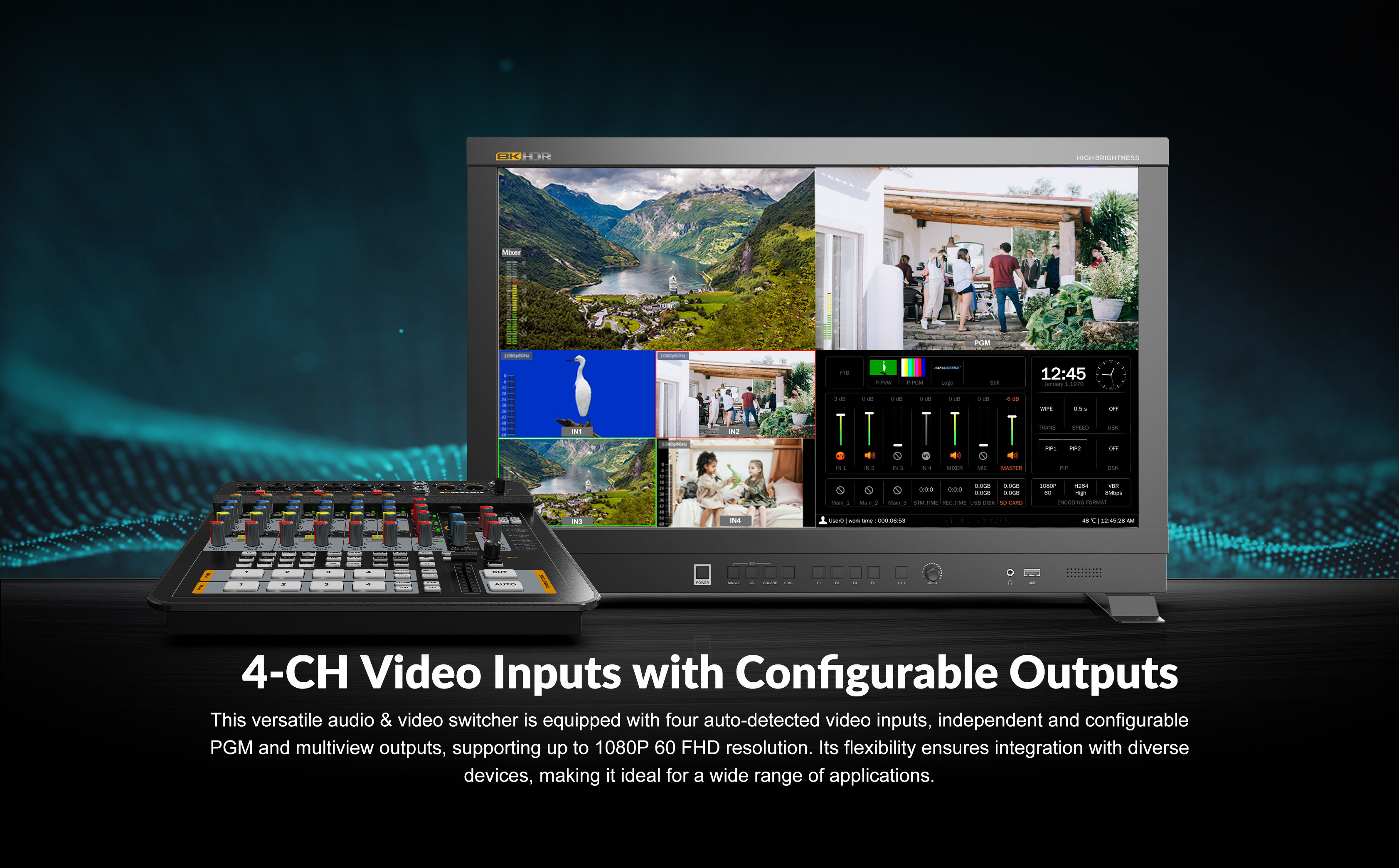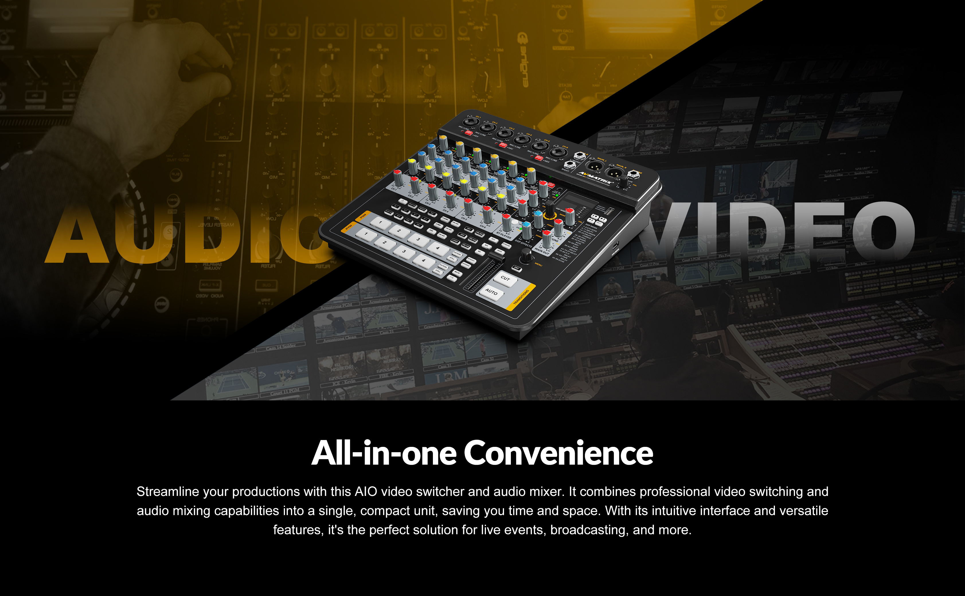 這款一體式便攜音視頻切換台具有6個麥克風輸入、2個立體聲輸入和4通道嵌入式音頻。它配備平衡XLR輸出和TRS監聽,帶增益控制、信號指示燈、2段音調調節和低切濾波器。設備支援單聲道/立體聲切換、音量調節及99種DSP效果模式,還內置獨立藍牙播放器、MP3錄放功能和USB聲卡,並為XLR麥克風提供48V幻象供電。視頻方面,提供2路HDMI節目輸出、1路HDMI多畫面輸出和1個USB Type-C接口,支援RTMP/SRT推流、U盤/SD卡錄製,並集成了亮度/色度鍵、畫中畫/彈出畫面、DSK及LOGO疊加功能。切換台配備T型推桿、AUTO/CUT切換及多種特效(如劃像/混合/淡入淡出)。