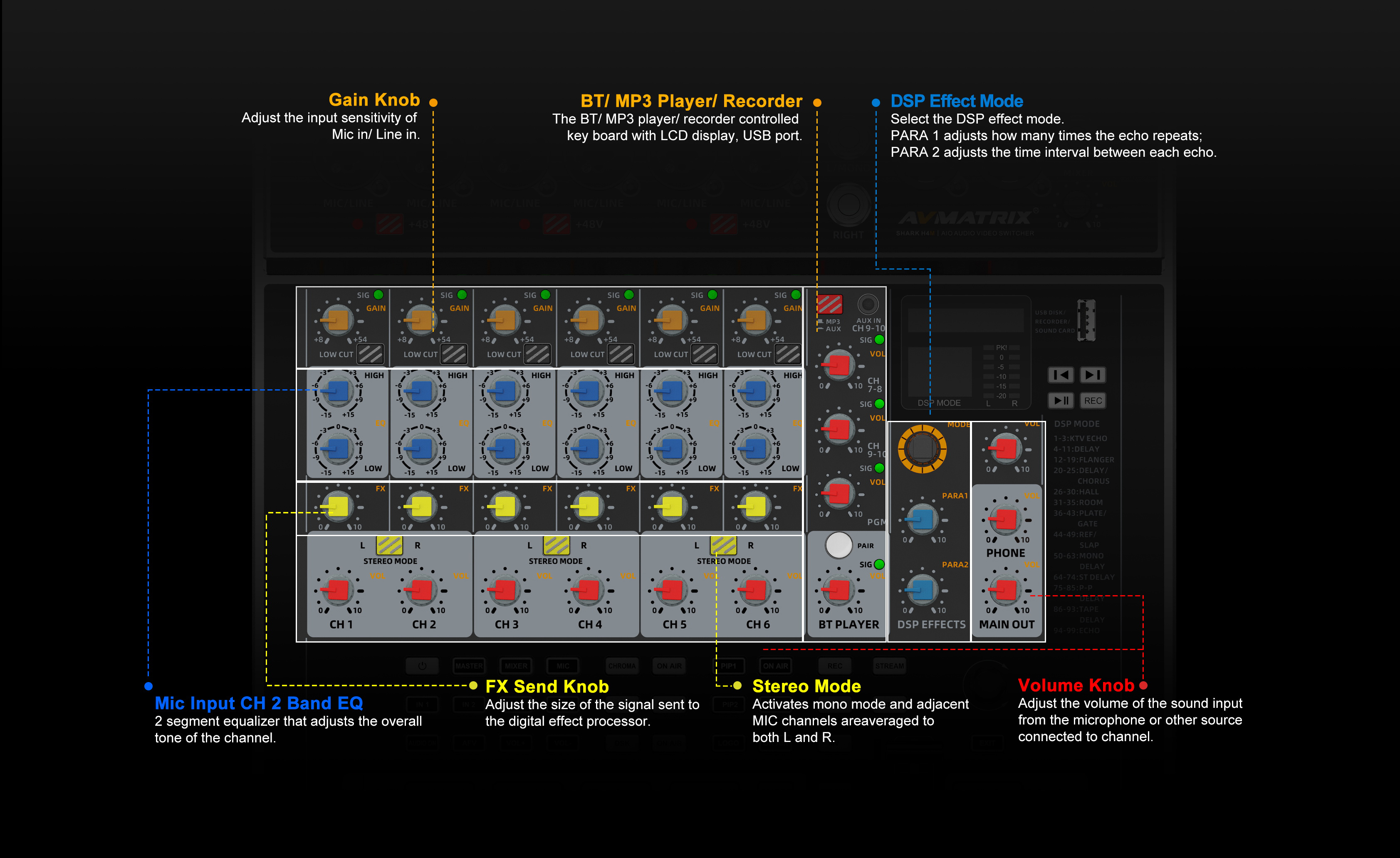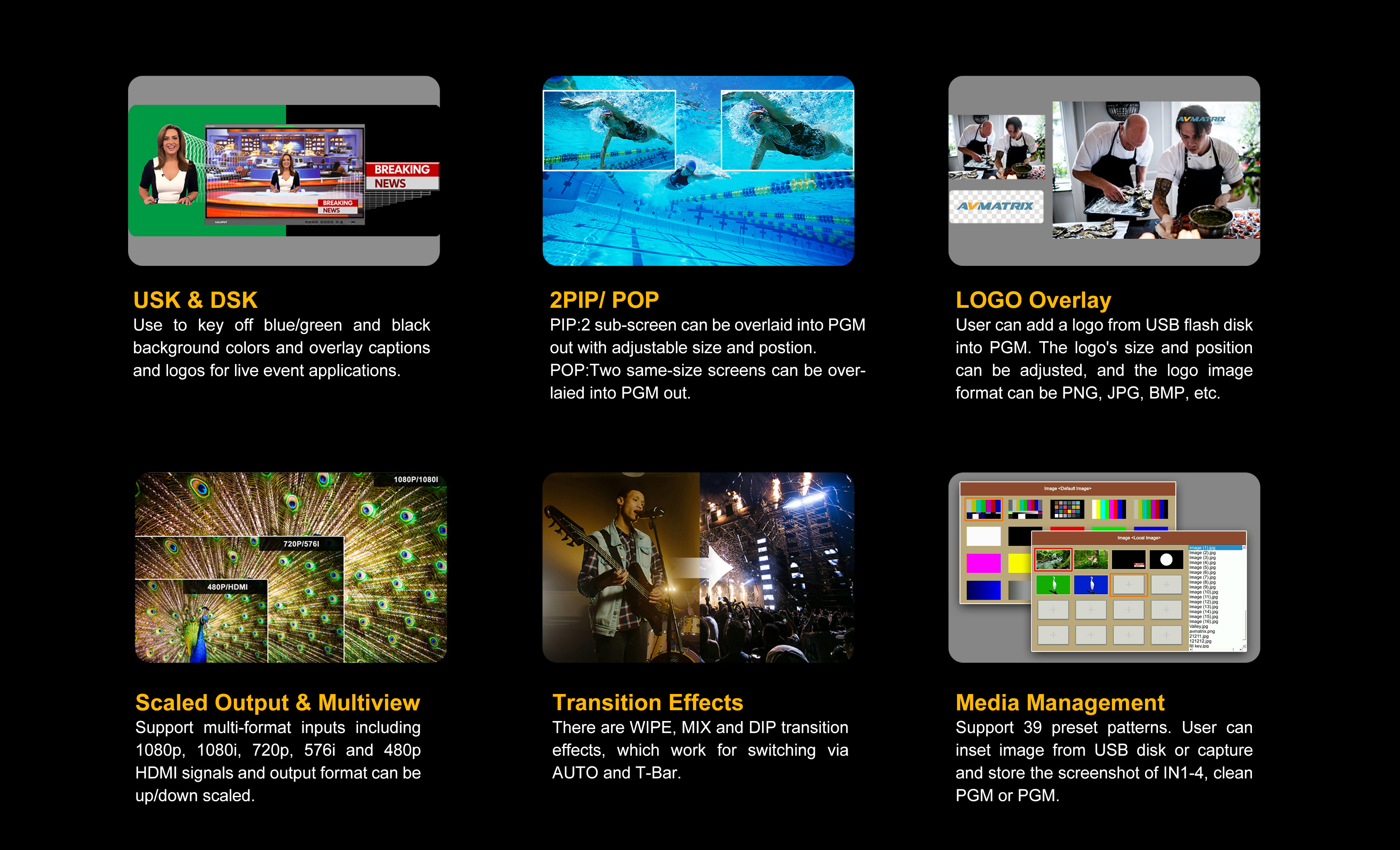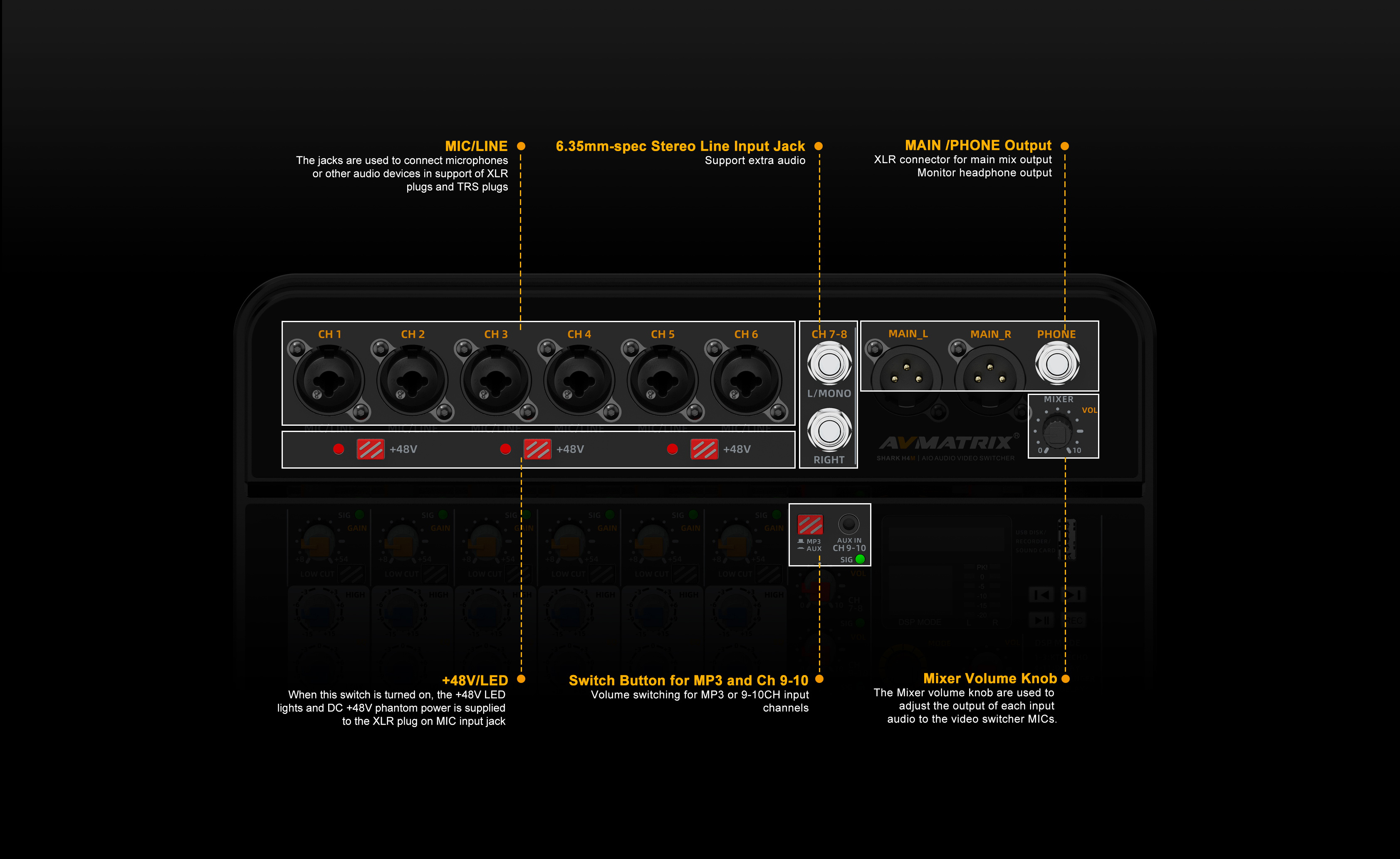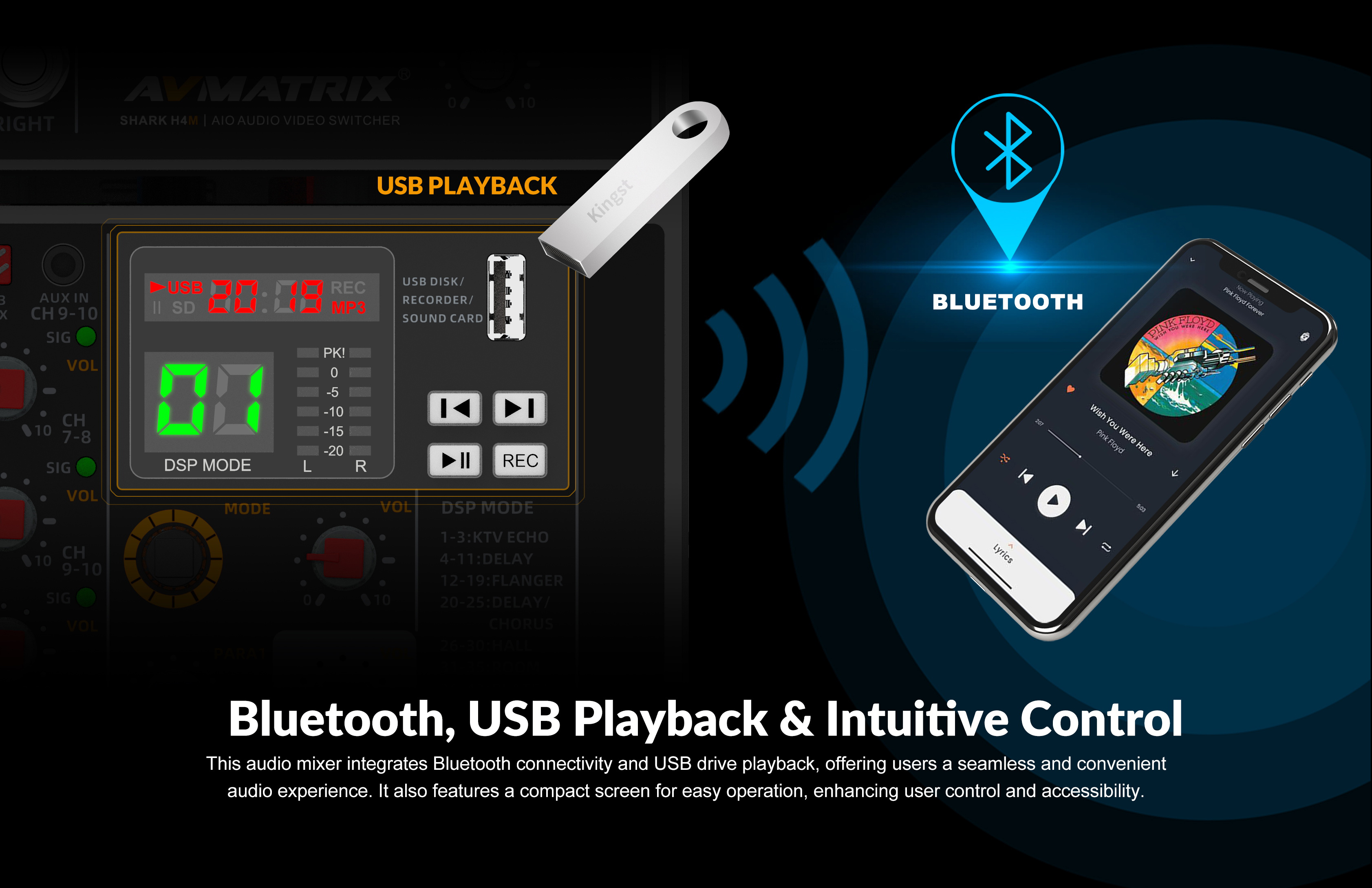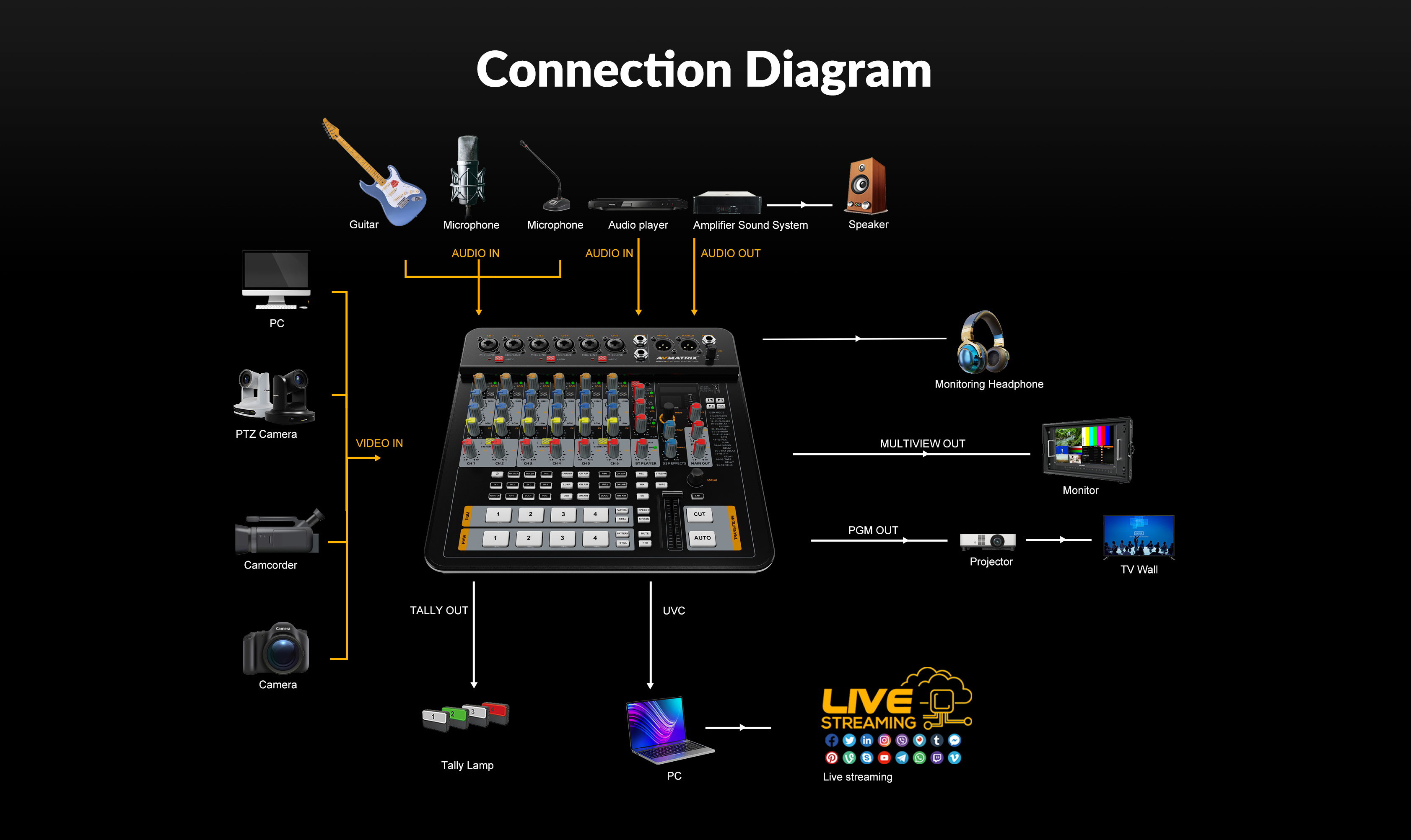 這款一體式便攜音視頻切換台具有6個麥克風輸入、2個立體聲輸入和4通道嵌入式音頻。它配備平衡XLR輸出和TRS監聽,帶增益控制、信號指示燈、2段音調調節和低切濾波器。設備支援單聲道/立體聲切換、音量調節及99種DSP效果模式,還內置獨立藍牙播放器、MP3錄放功能和USB聲卡,並為XLR麥克風提供48V幻象供電。視頻方面,提供2路HDMI節目輸出、1路HDMI多畫面輸出和1個USB Type-C接口,支援RTMP/SRT推流、U盤/SD卡錄製,並集成了亮度/色度鍵、畫中畫/彈出畫面、DSK及LOGO疊加功能。切換台配備T型推桿、AUTO/CUT切換及多種特效(如劃像/混合/淡入淡出)。