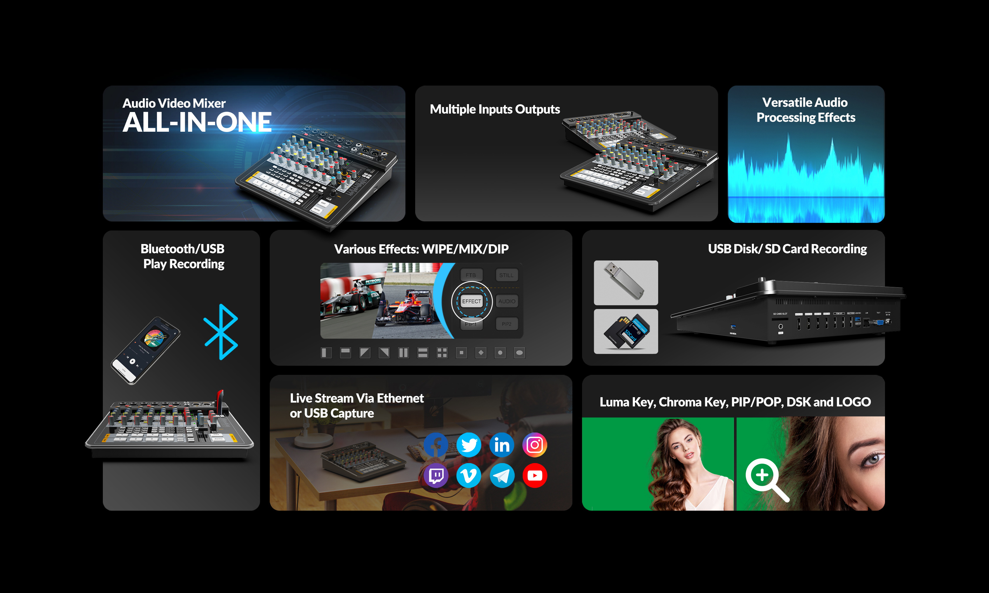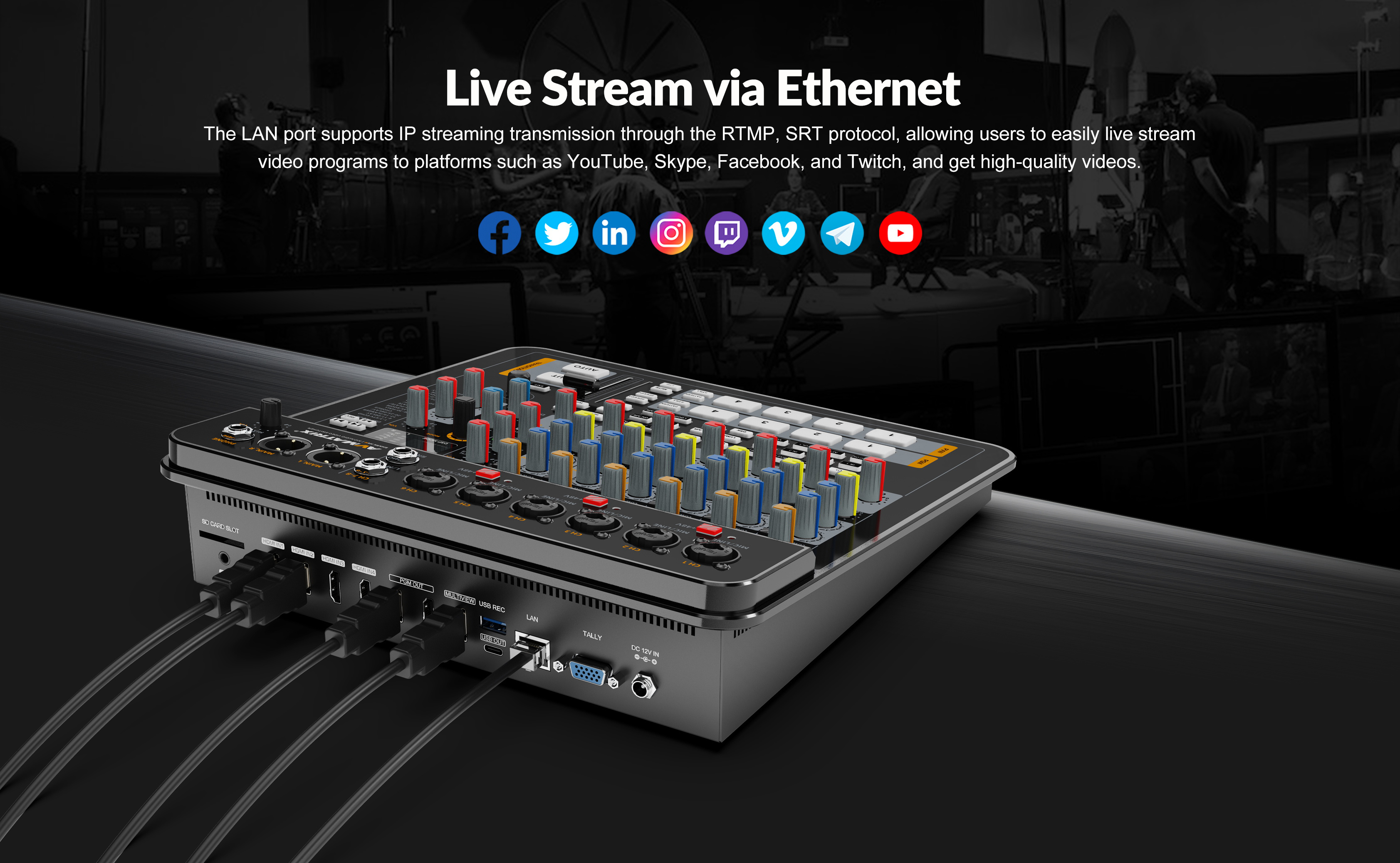這款多功能切換台集專業音頻處理和視頻切換於一體,適合現場製作。豐富的接口、特效及流媒體支援使其成為高效的全能解決方案。