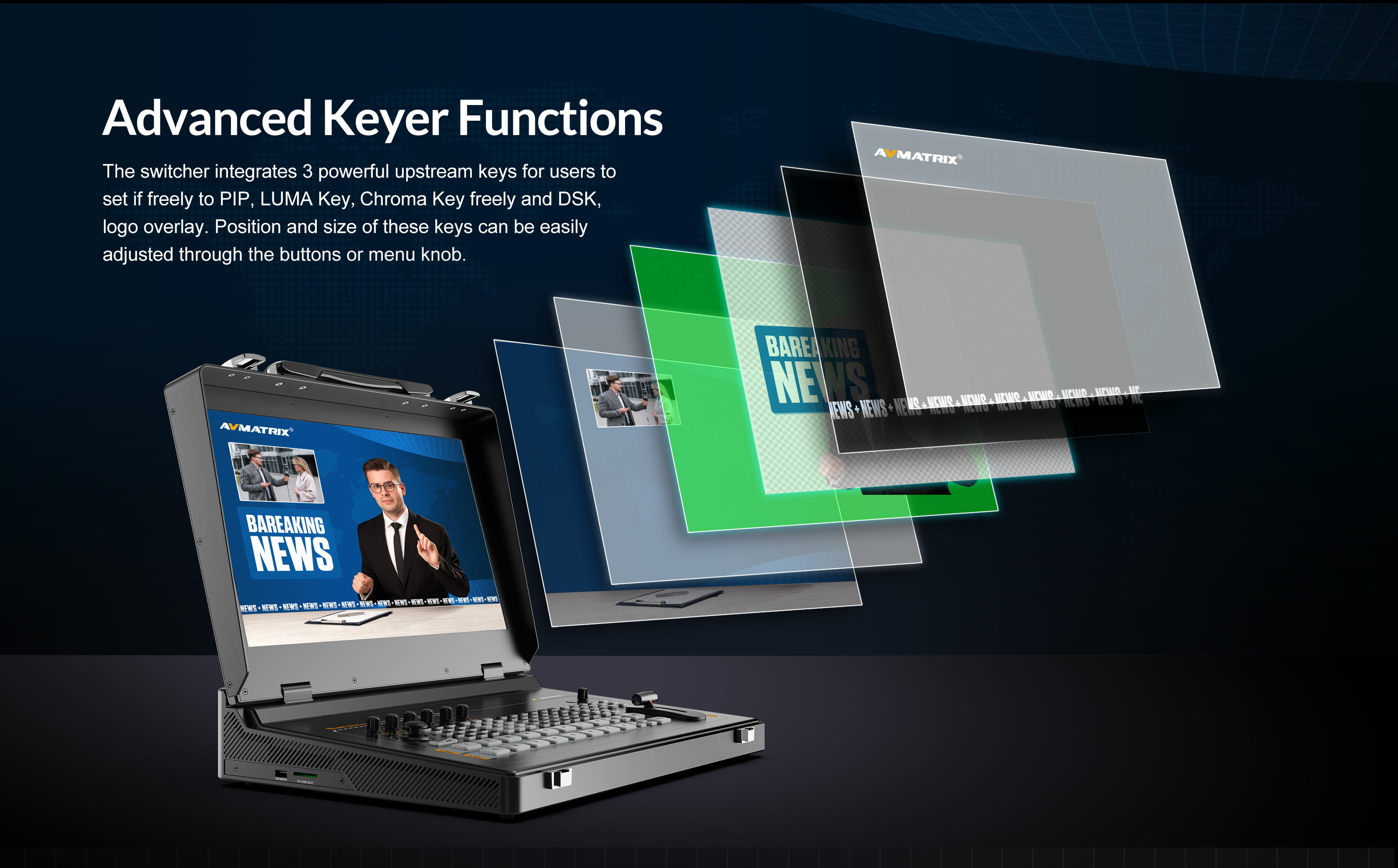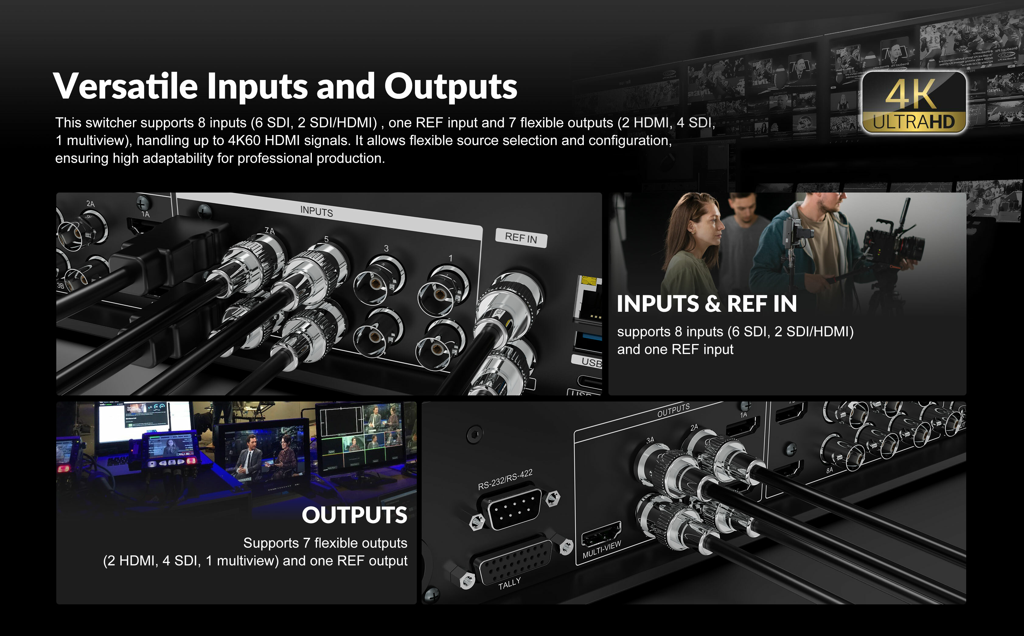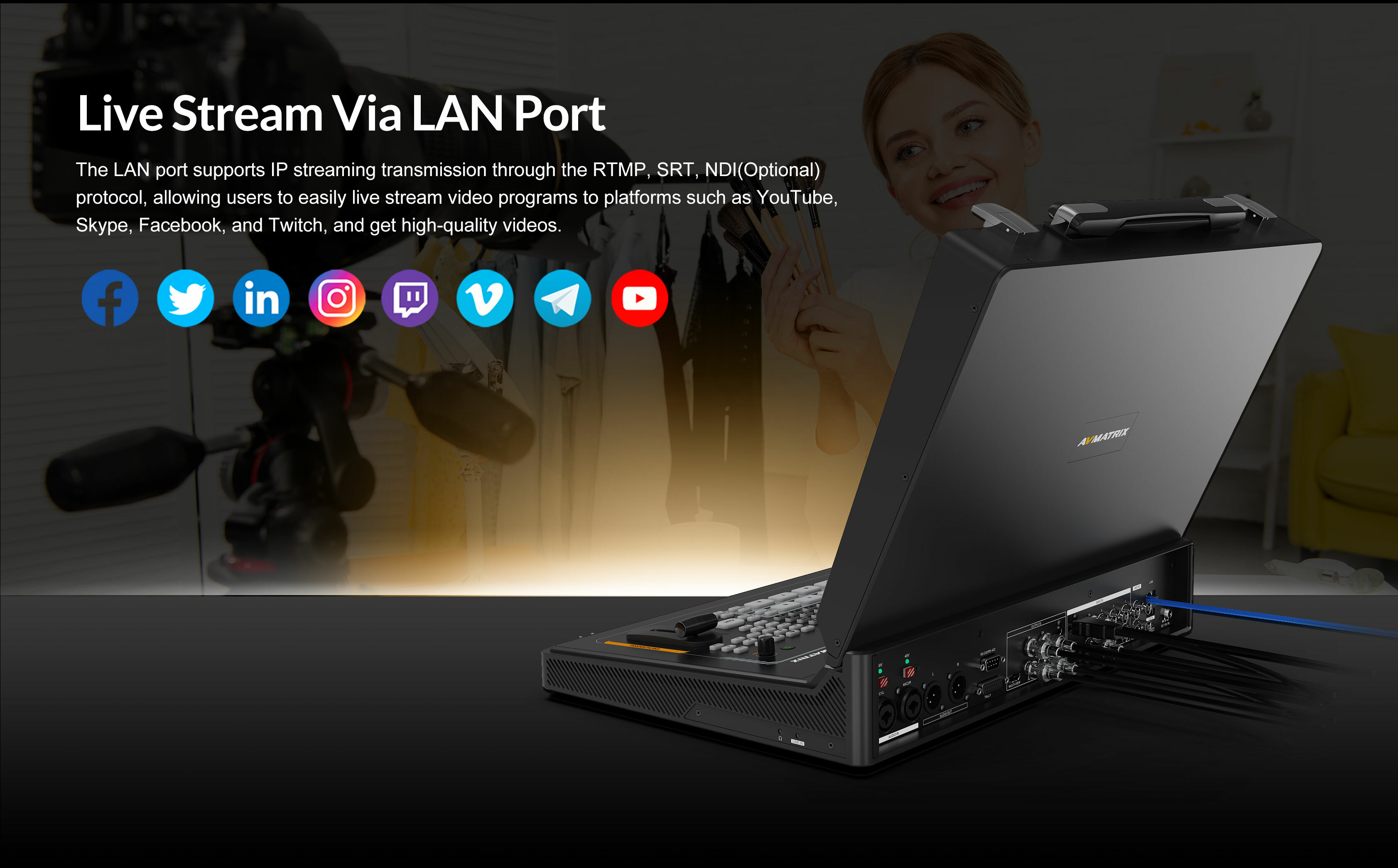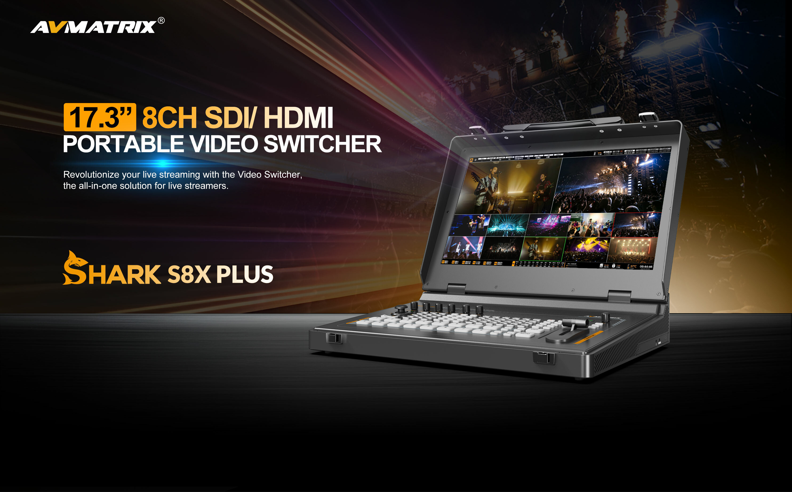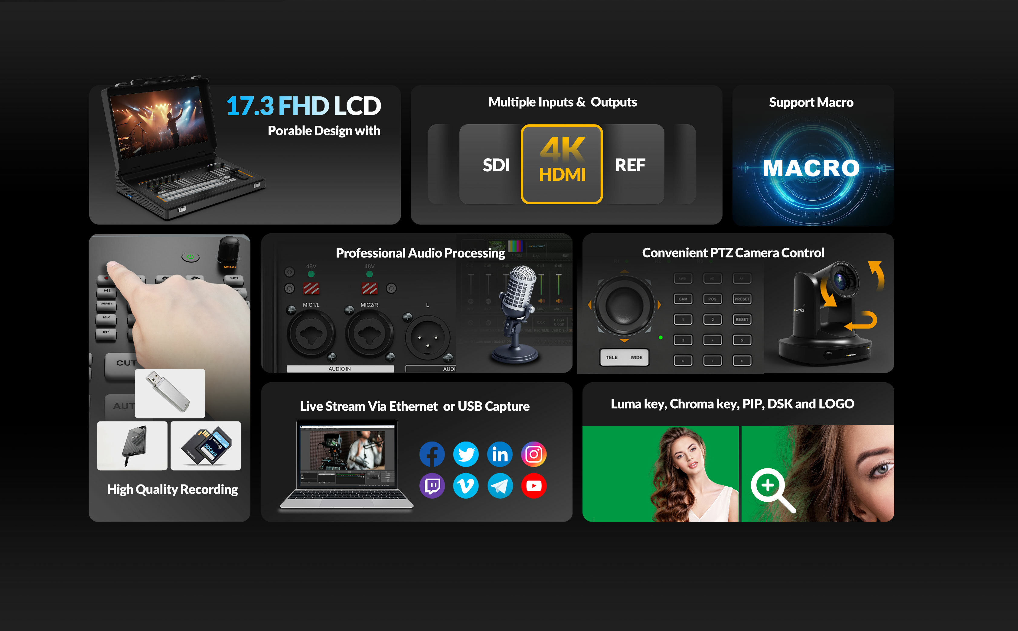 這款8通道SDI/HDMI專業視訊切換器是集多路訊號切換、直播串流、錄製及PTZ攝影機控制於一體的便攜式製作中心,配備17.3吋觸控螢幕,專為現場活動與廣播需求設計。