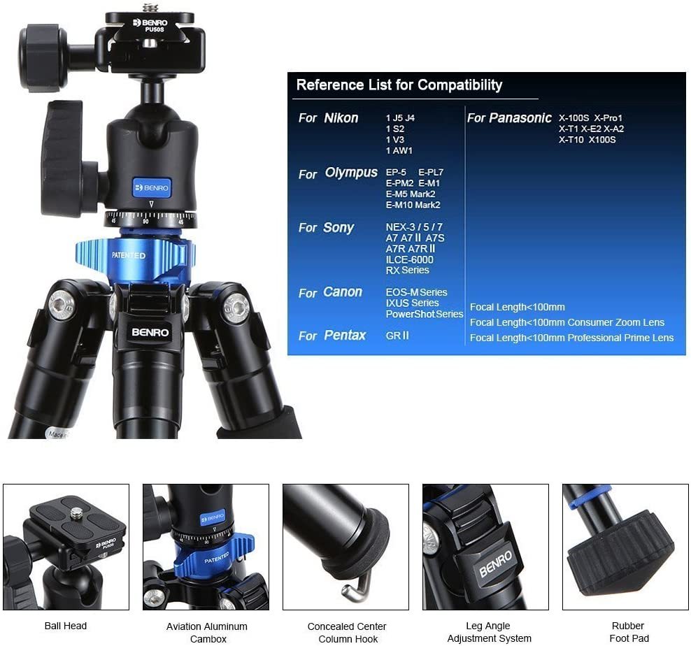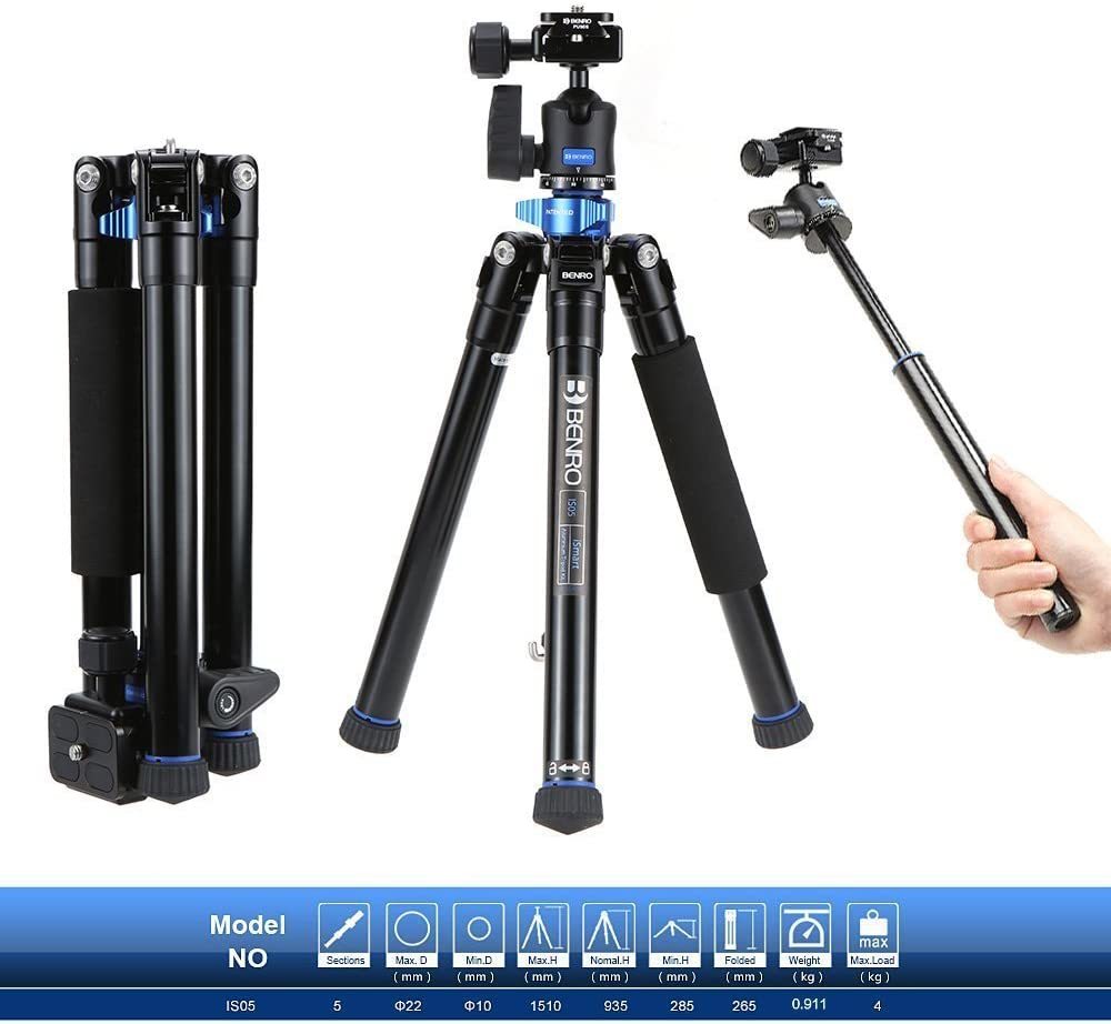 Benro IS-05 輕便腳架, 淨重 0.92kg 折合長度 26.5 cm, 伸縮比極高, 全開高度可達151cm, 可承重4kg, 可變身自拍杆, 非常適合旅行使用.