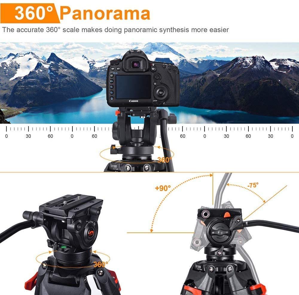 • 頭部可水平360°旋轉。內置阻尼和動平衡系統使流體頭部操作平穩,可垂直傾斜+90°/-75°,最大負載為13.2 lbs。