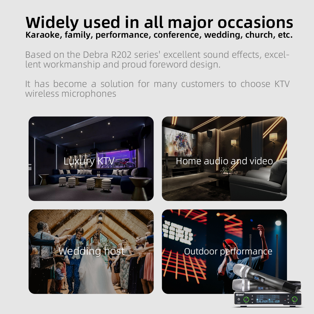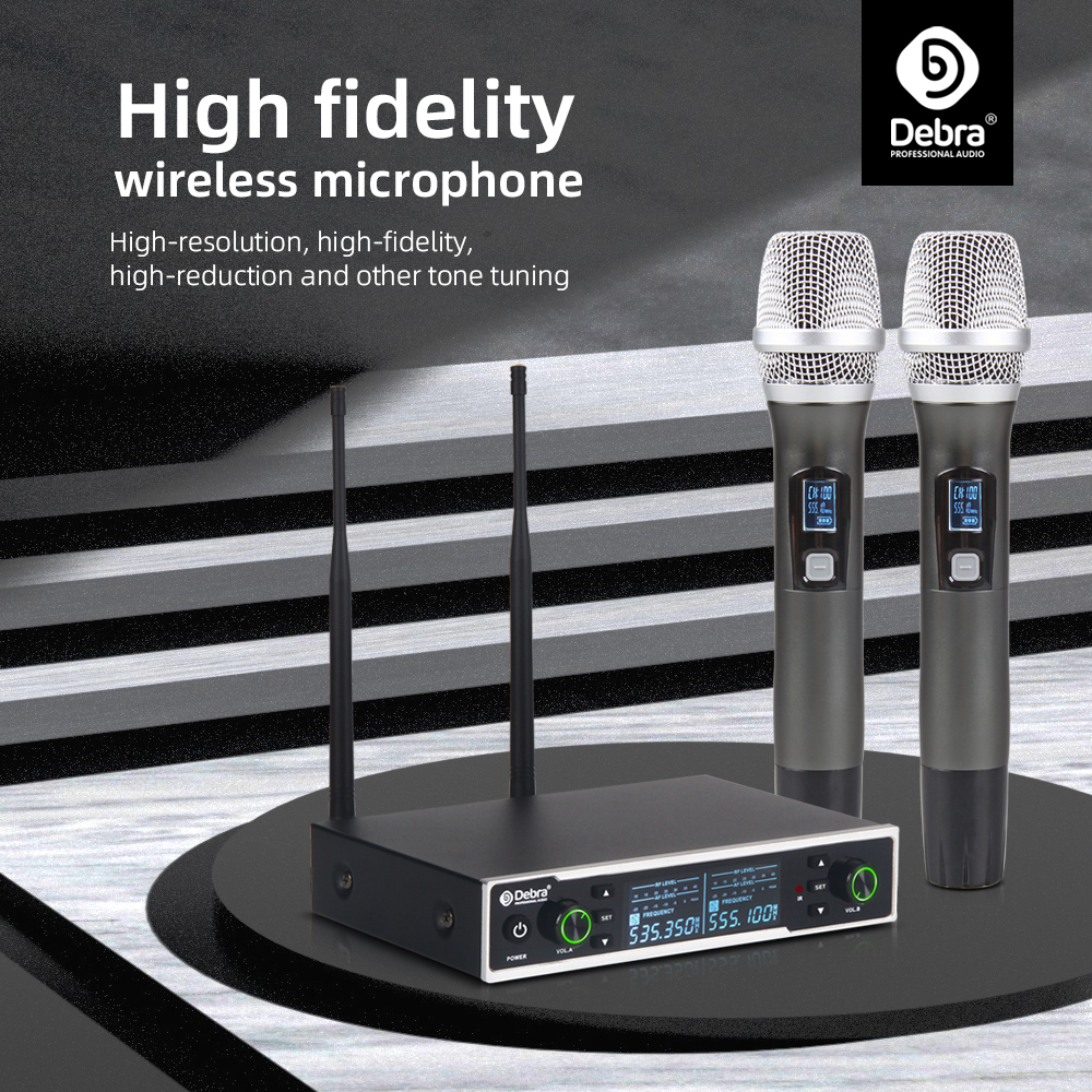 Debra Audio 的新型 UHF 無線麥克風-R202。全金屬精品無線話筒系統,採用UHF高頻傳輸,多頻可調,完美避免干擾煩惱。迷你接收器具有全新設計的面板和外觀。高品質手持麥克風采用高檔鋁合金製成。手持發射器和接收器使用紅外鏈接。可自動搜索頻率,選擇最安全的頻率點。這是一個非常優秀的功能,易於使用。