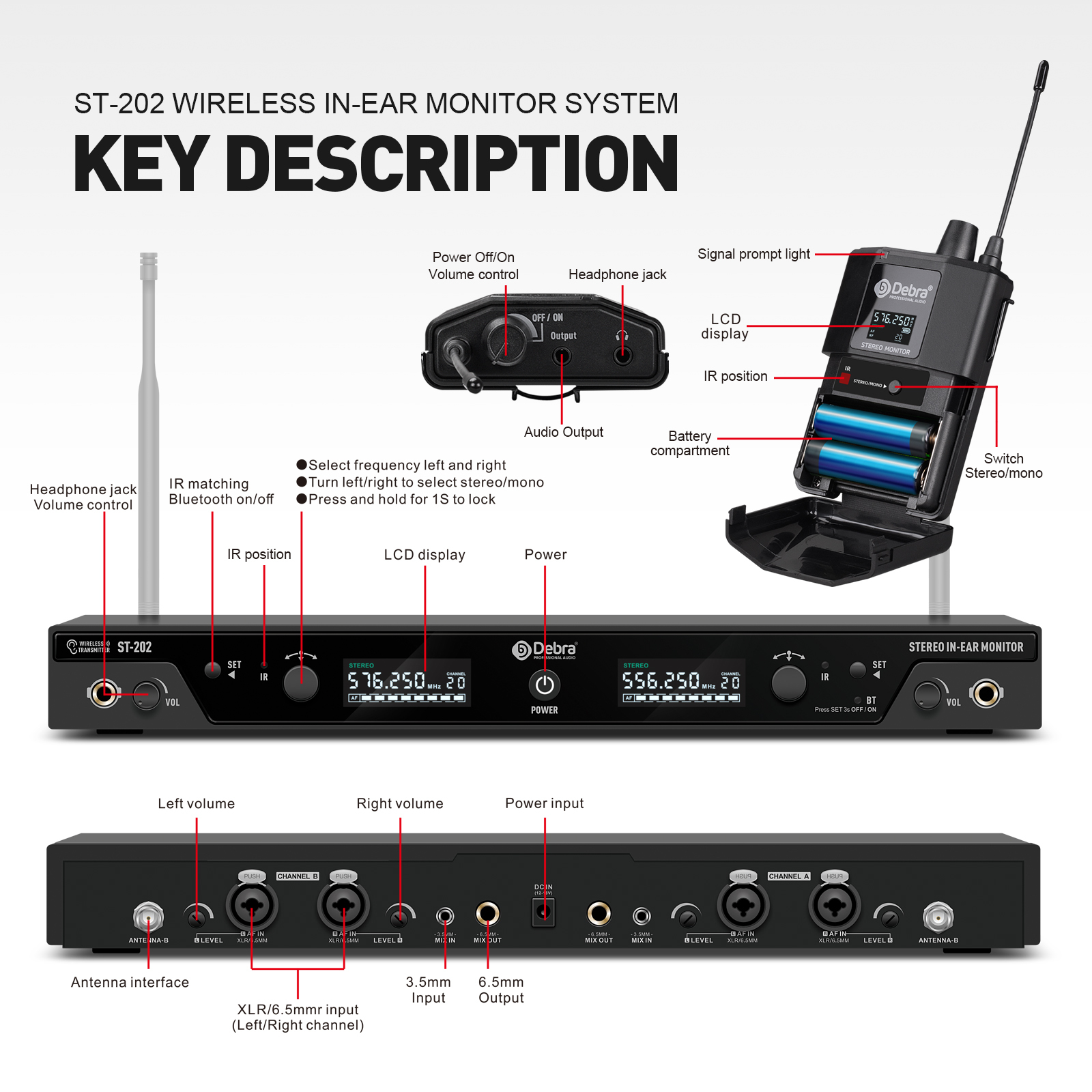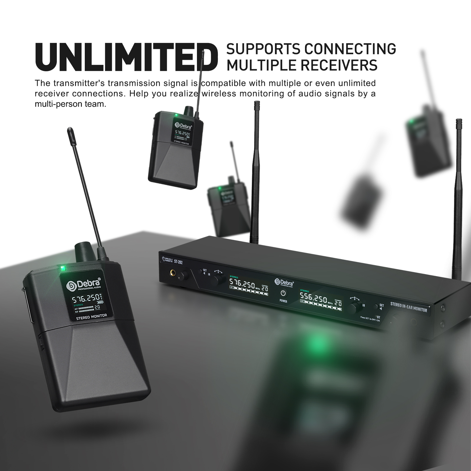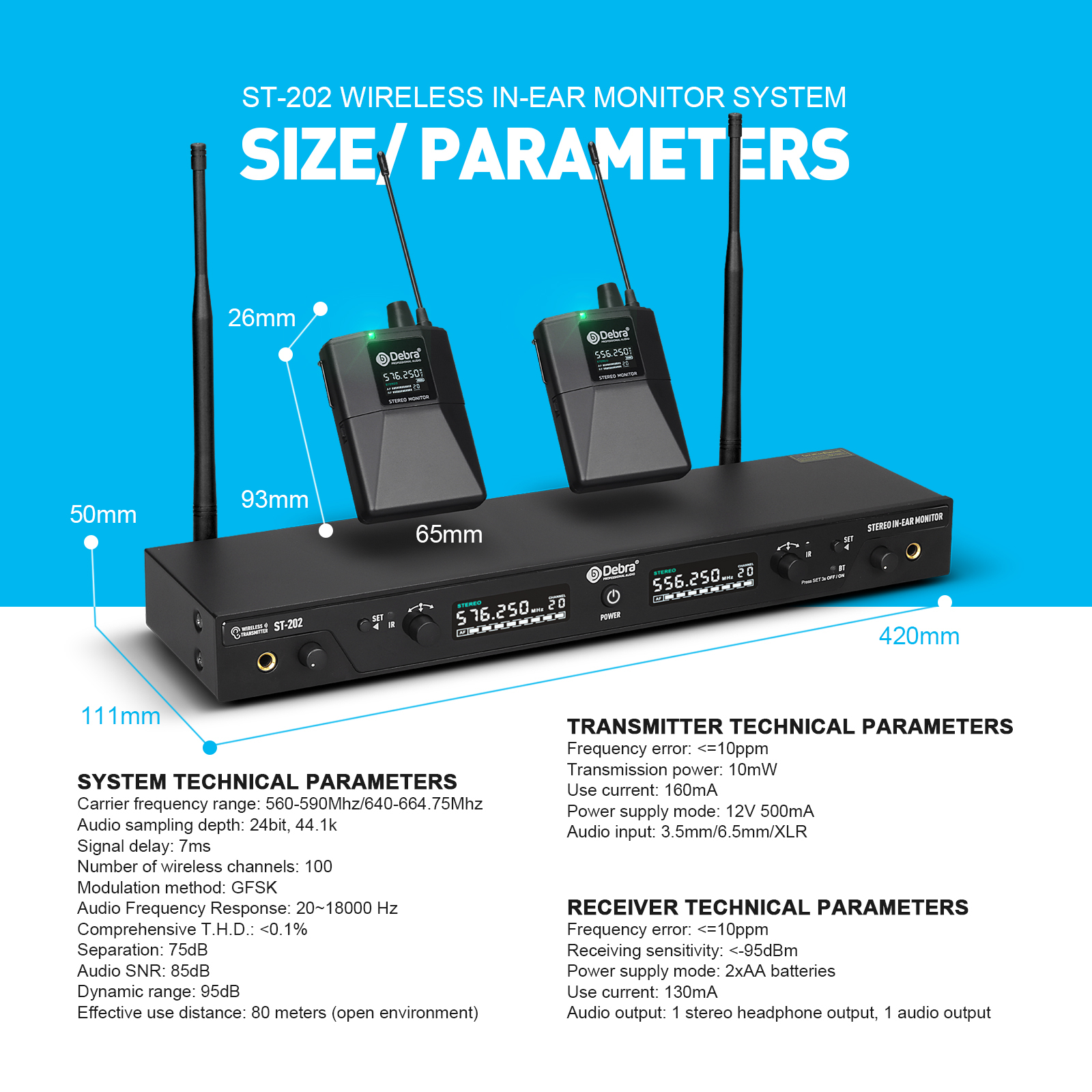 Debra ST-102 是專業立體聲耳內無線監聽系統,具備優秀信號穩定性及超低白噪音。ST-202 升級版具雙通道發射器和可開關藍牙5.0,適用於多種場景,性價比高。