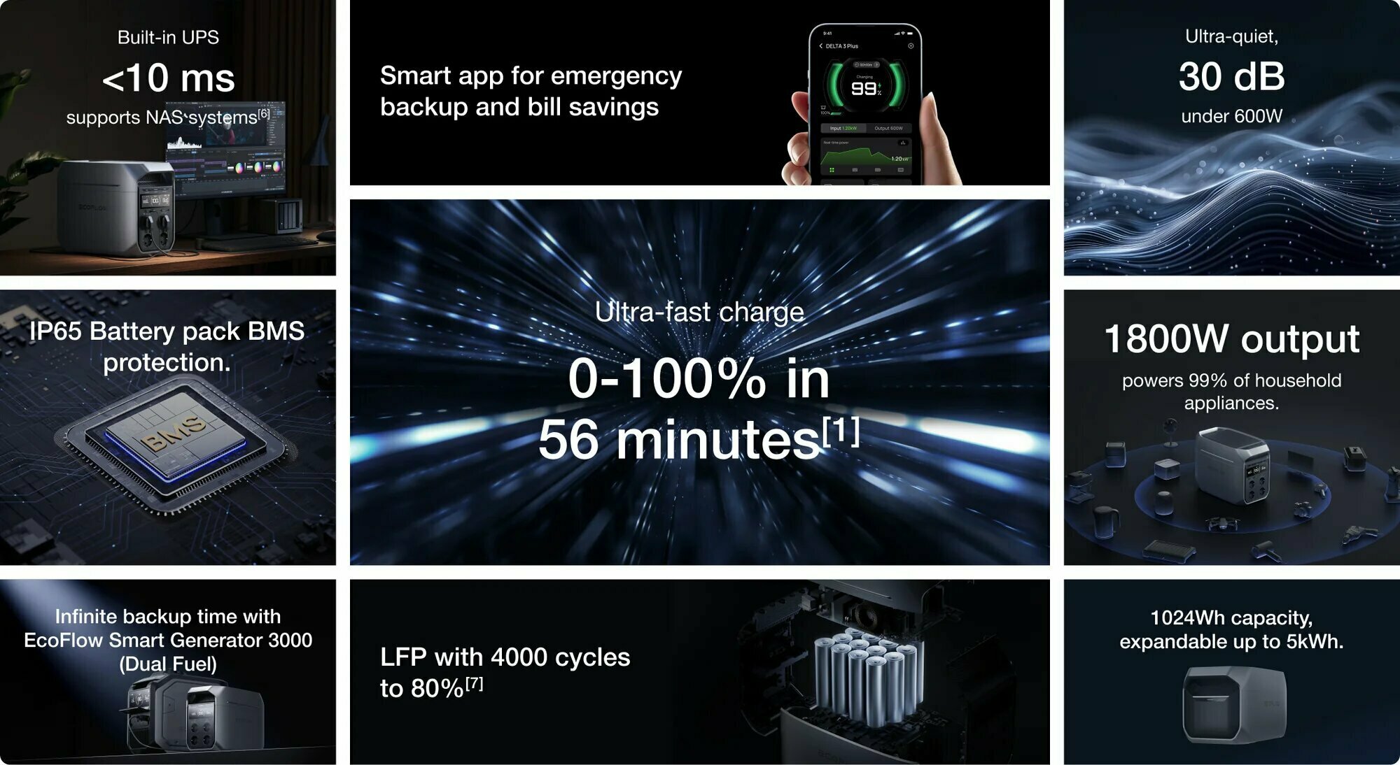 這款堅固的輸出系統具備1800W(峰值3600W)功率,運行噪音僅30 dB,適合於任何環境使用。配備 EcoFlow Oasis 智能能源管理系統,提供安全的備用電源,並支持靈活擴展至5kWh。