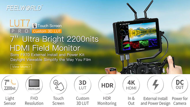 FEELWORLD LUT7 PRO可以在白天拍攝時進行清晰,精確的現場監控和圖像分析。它在1920英寸顯示屏上以出色的色彩保真度和1200 x 7最大分辨率顯示靜止圖像和監視內容。面板由具有抗反射塗層的光學粘合玻璃製成,可實現舒適的白天現場監控。但真正使它與眾不同的是其發光二極管(LED)背光,其輸出的亮度為2200尼特,並顯示1200:1的對比度和sRGB / Rec.709色域,即使在強光下也能提供出色的屏幕清晰度條件。監視器以每英寸323像素(PPI)的速度顯示內容時,您可以放心地在寬廣的日光下拍攝,並當場優化內容。 160º的寬視角使多個工作人員可以輕鬆地同時觀看。