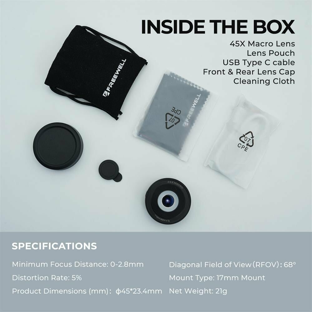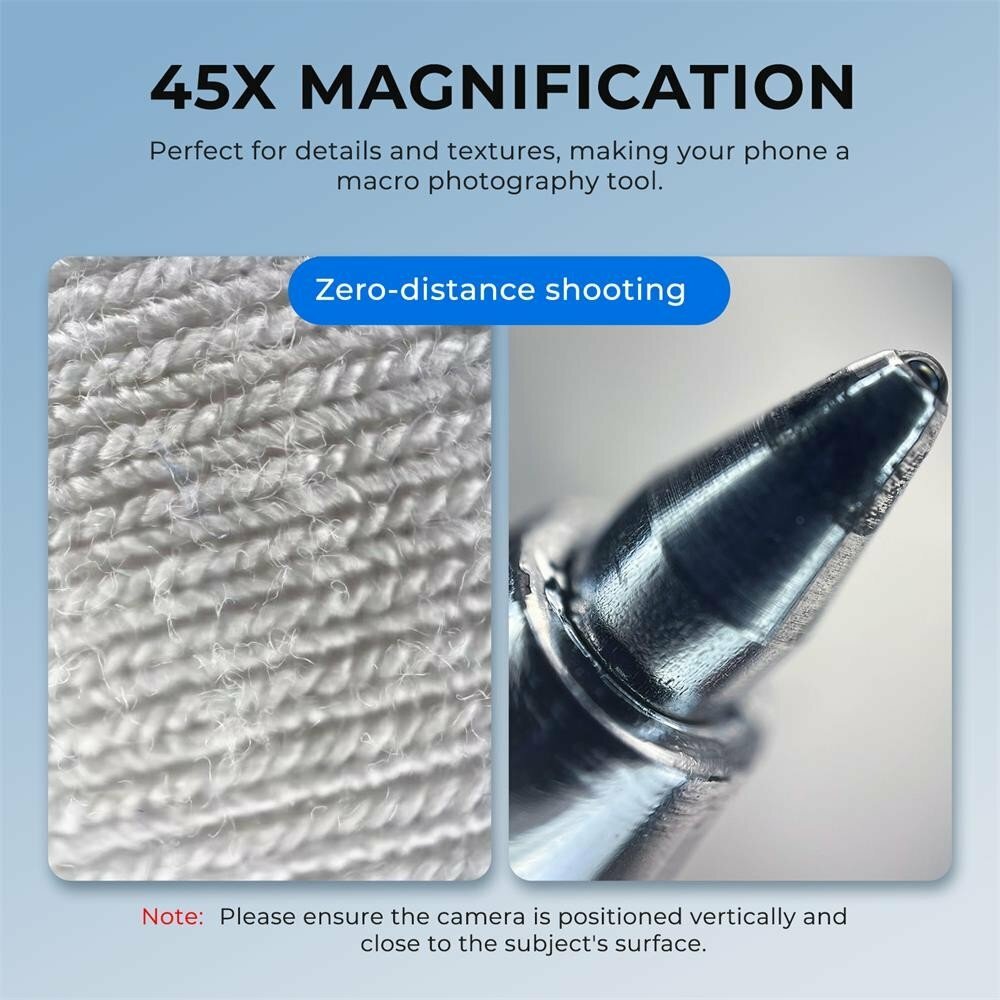 45倍放大倍率,展現精細細節。多層鍍膜光學元件提升清晰度。耐用鋁製機身,內建微距照明,方便拍攝。