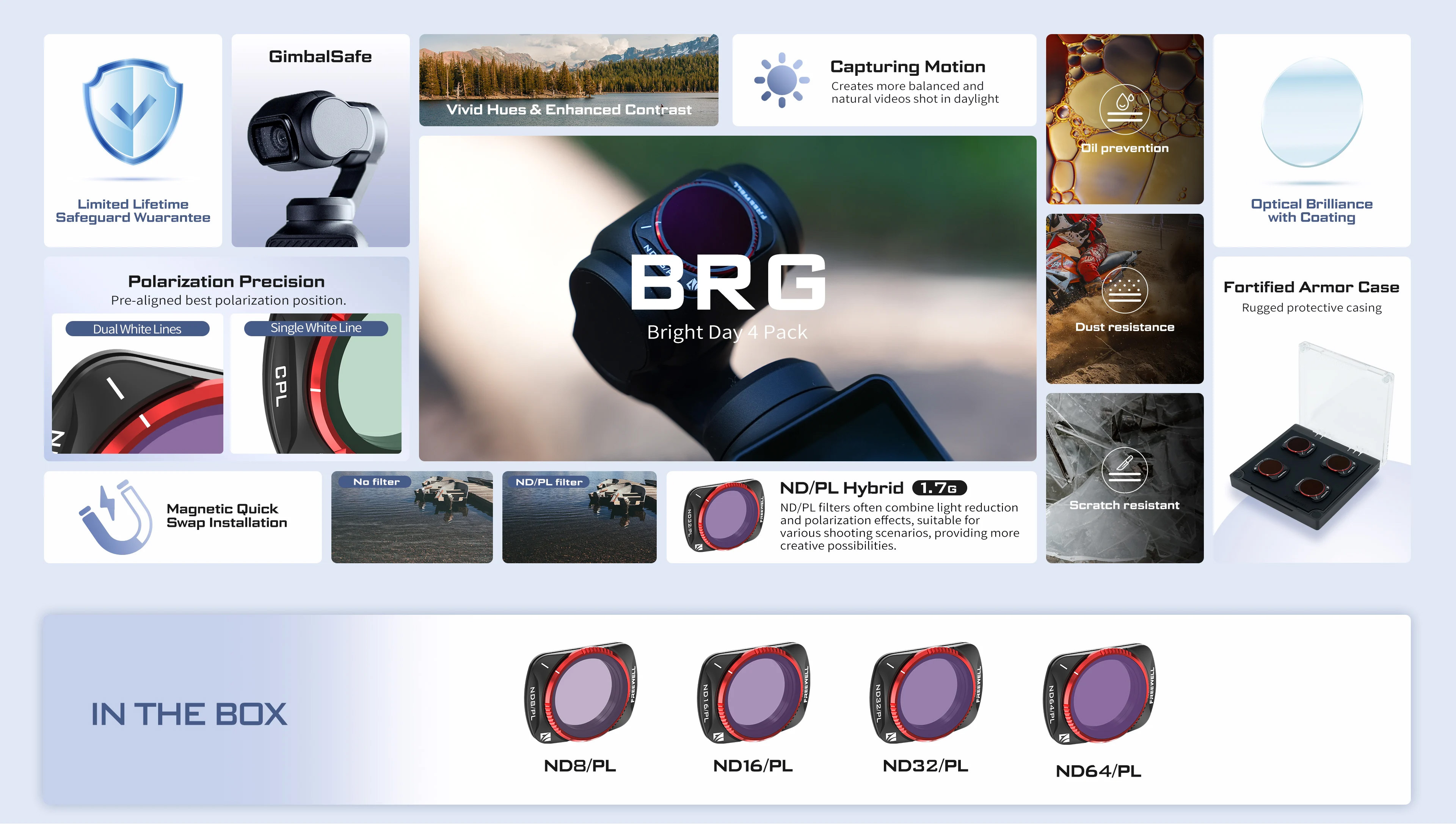 包含:ND8/PL鏡、ND16/PL鏡、ND32/PL鏡、ND64/PL鏡、濾鏡盒、清潔布