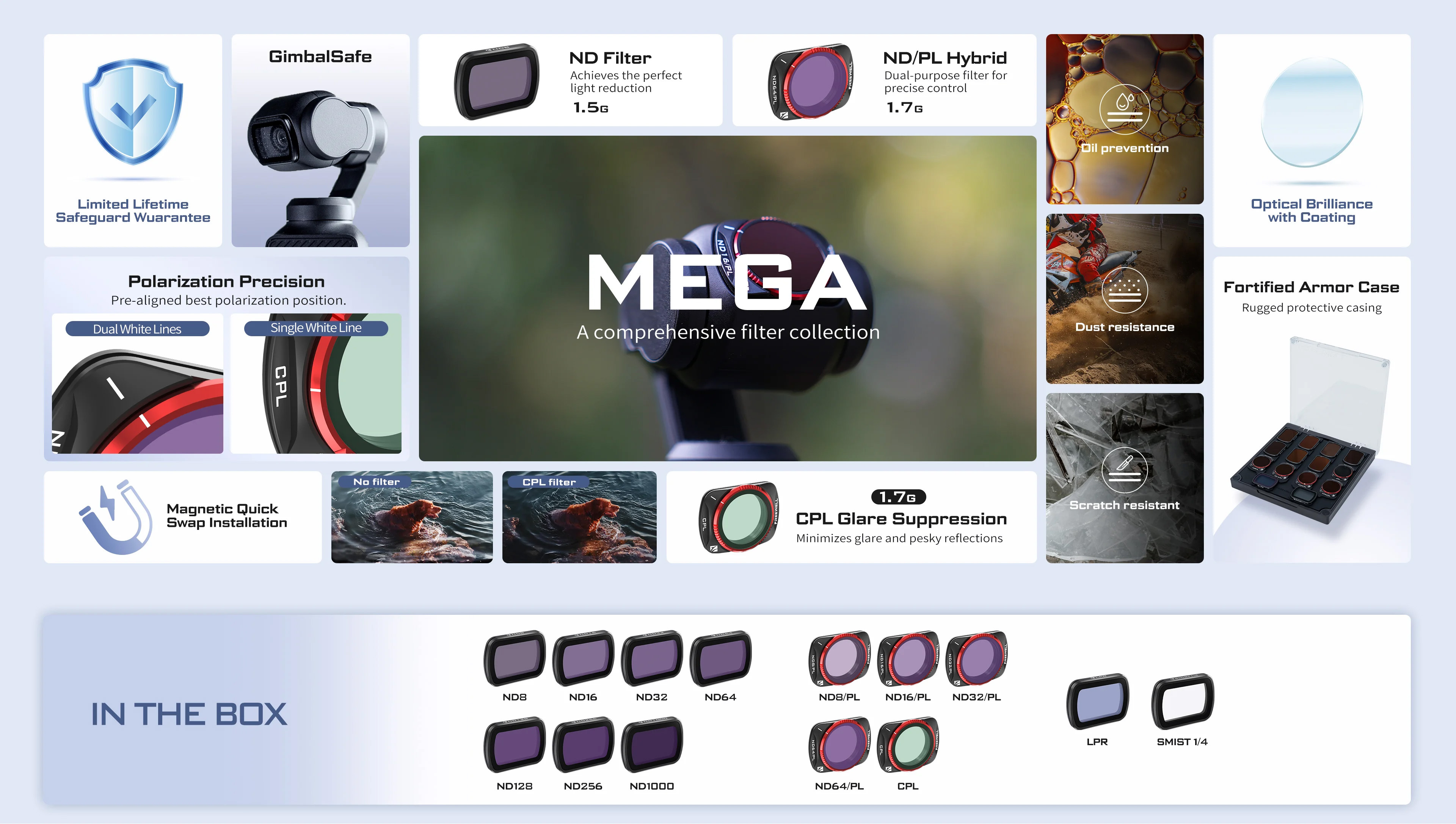 內容物:ND8、ND16、ND32、ND64、ND128、ND256、ND1000、ND8/PL、ND16/PL、ND32/PL、ND64/PL、SMIST1/4、LPR、CPL 濾鏡、濾鏡收納盒、清潔布