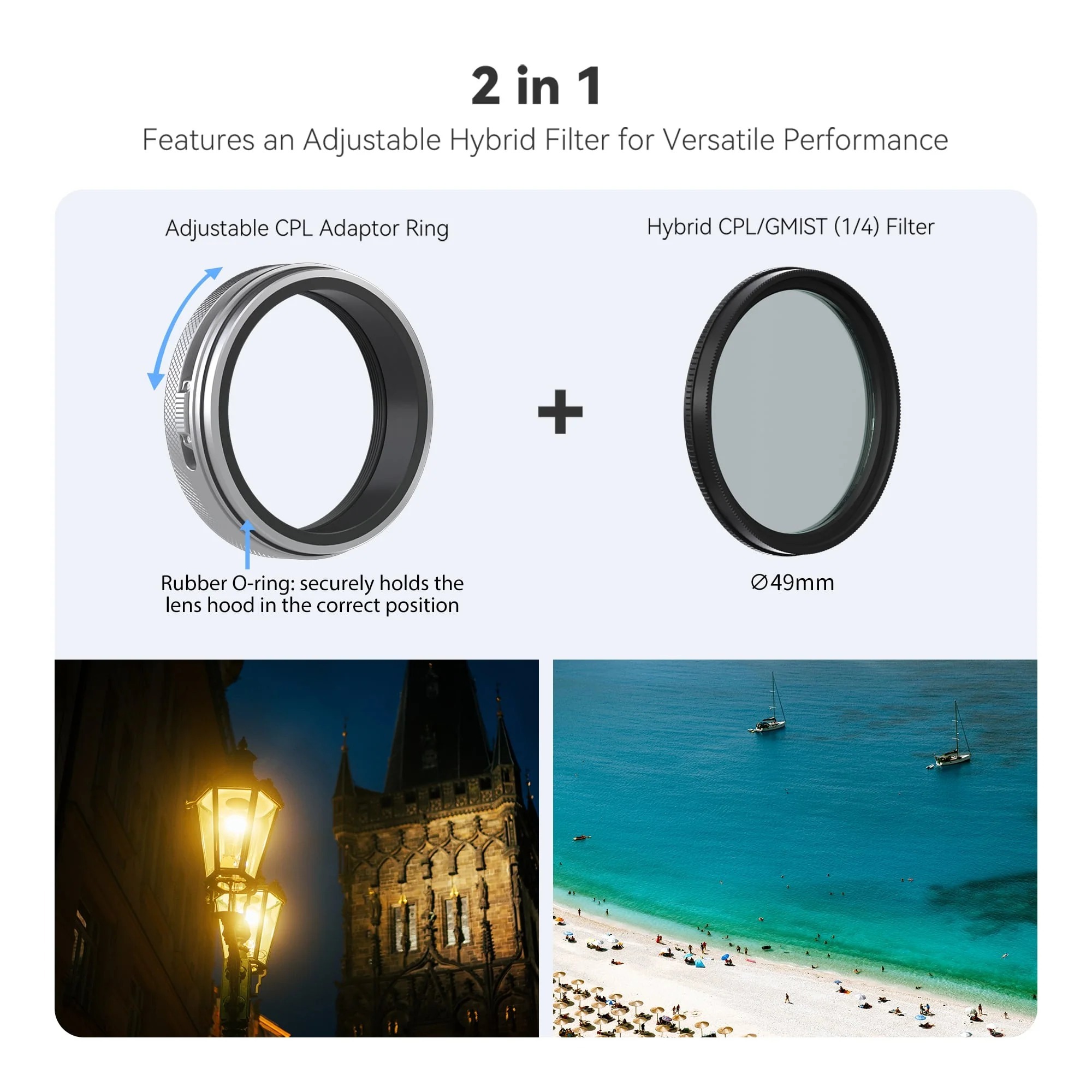 這款全面的套裝將提升您的富士 X100VI/X100V 攝影體驗,包含多功能二合一微距和廣角鏡頭,可捕捉從細緻特寫到廣闊風景的各種景緻。輕巧的 1.5 倍遠攝鏡頭可將遠處的主體清晰對焦,非常適合拍攝野生動物和人像。此外,創新的混合 CPL/輝光霧濾鏡可減少眩光、豐富色彩並增添電影般的光暈效果,從而提升您的影像質量,同時還能保護您的鏡頭。這款套裝將您拍攝專業品質照片所需的一切盡在一個便攜易用的套裝中。