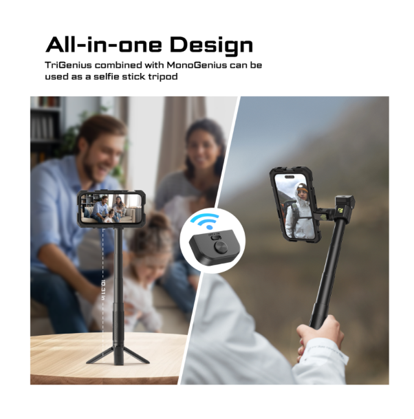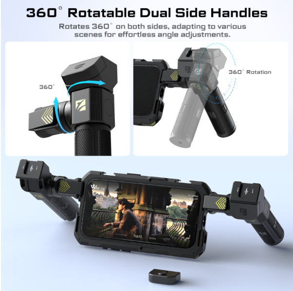可牢固固定手機的快拆夾、多功能三腳架/單腳架手柄、藍牙遙控器、可擴展的配件接口。