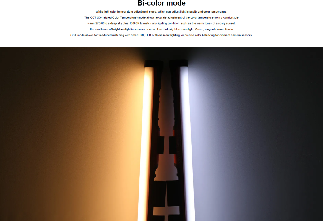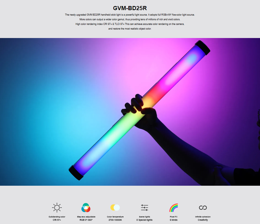 The 24" BD25R Bi-Color RGB LED Light Wand from GVM has a 25W beam and a 97 CRI rating for precision color rendering. It works as a serious light source or a fun, handheld accessory light for spontaneous effects.