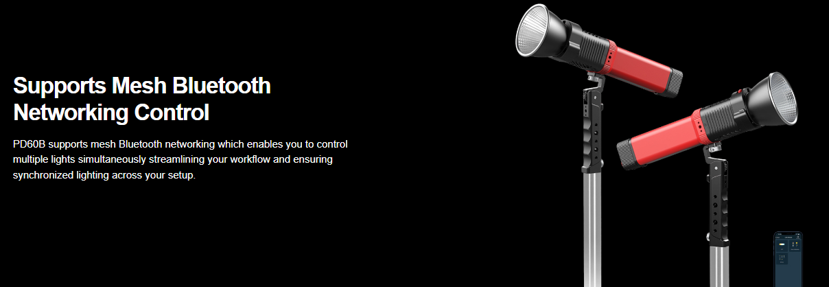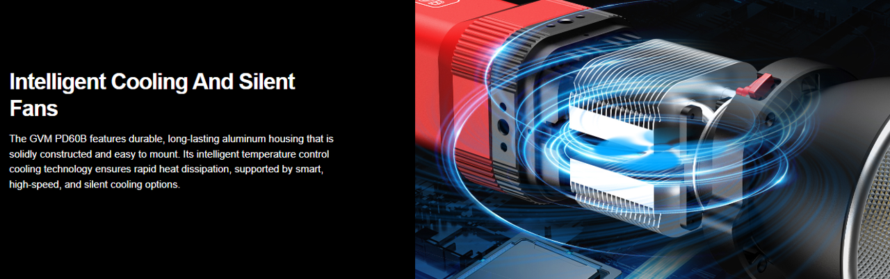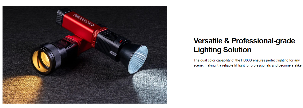 If the shooting environment requires silence, the fixture can be set to a convenient silent mode.The PD60B is efficient in dissipating heat with integrated heat sinks and a fan, so you don't have to worry about noise interfering with your productions. The fan operates in three modes: smart, high-speed, and silent.