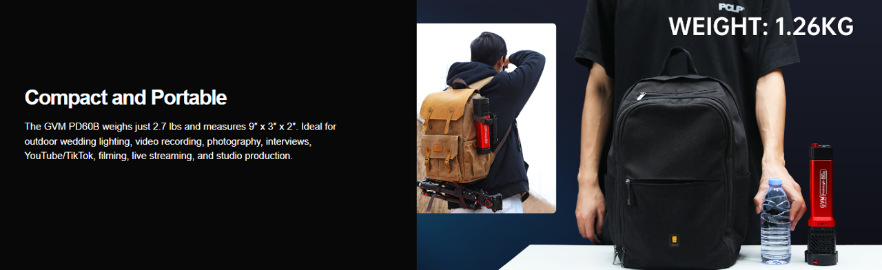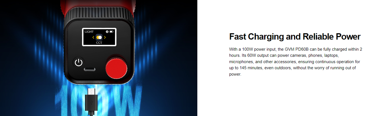 The PD60B has an integrated, rechargeable battery. GVM includes an USB-C cable, but the fixture also works with an optional 100W power adapter that supports PD fast-charging.