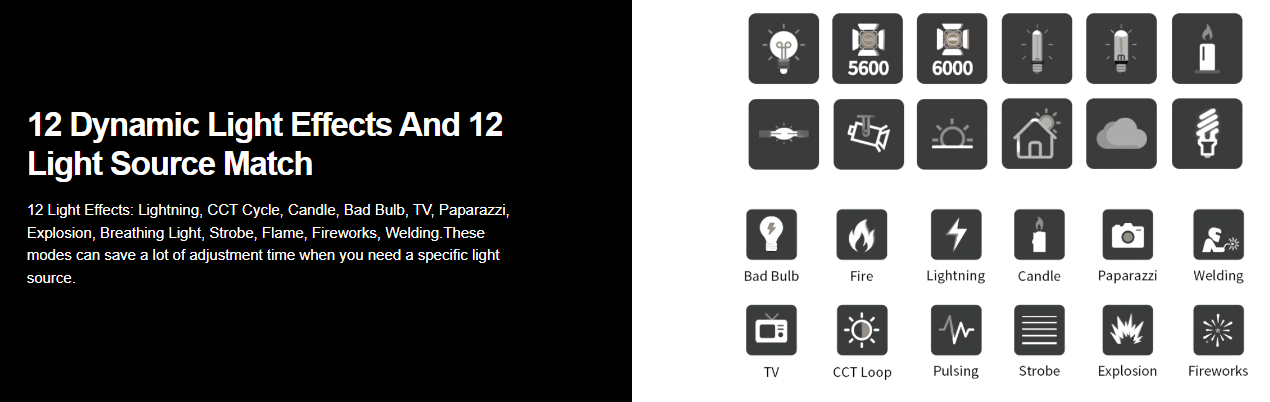 The PD60B features creative effects for lighting simulations, including lightning, CCT loop, candle, bad bulb, TV, paparazzi, explosion, pulsing, strobe, fire, fireworks, and welding.