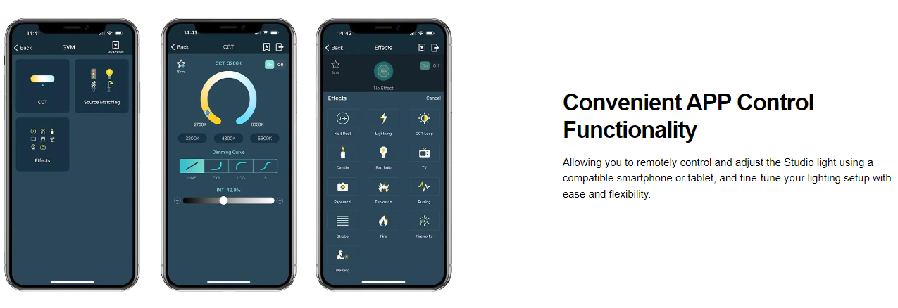 Use the GVM app to control the PD60B from a distance using iOS or Android smartphones.