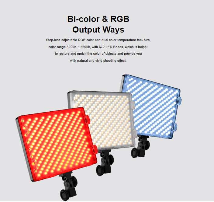 Step-less adjustable and dazzling RGB colors. Dual color temperature feature, CCT range 3200K ~ 5600k, 672 LED Beads, dimming rage for 0% to 100%, which is helpful to restore and enrich the color of shooting objects and provide you with natural and vivid shooting effect.