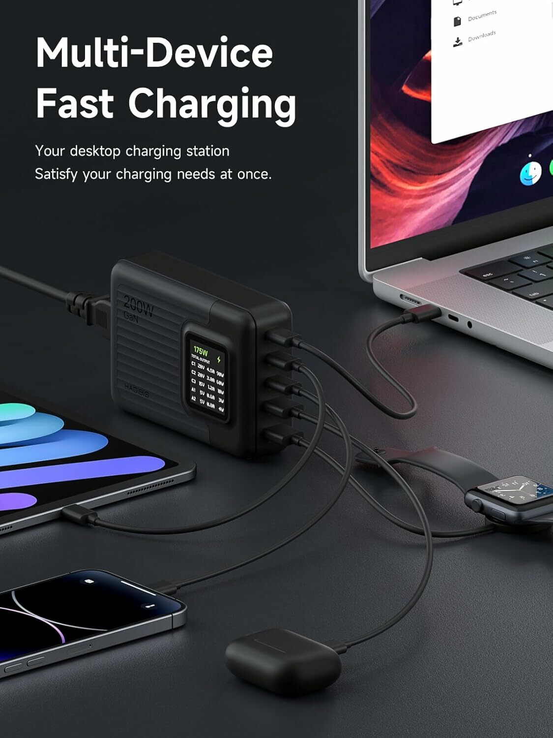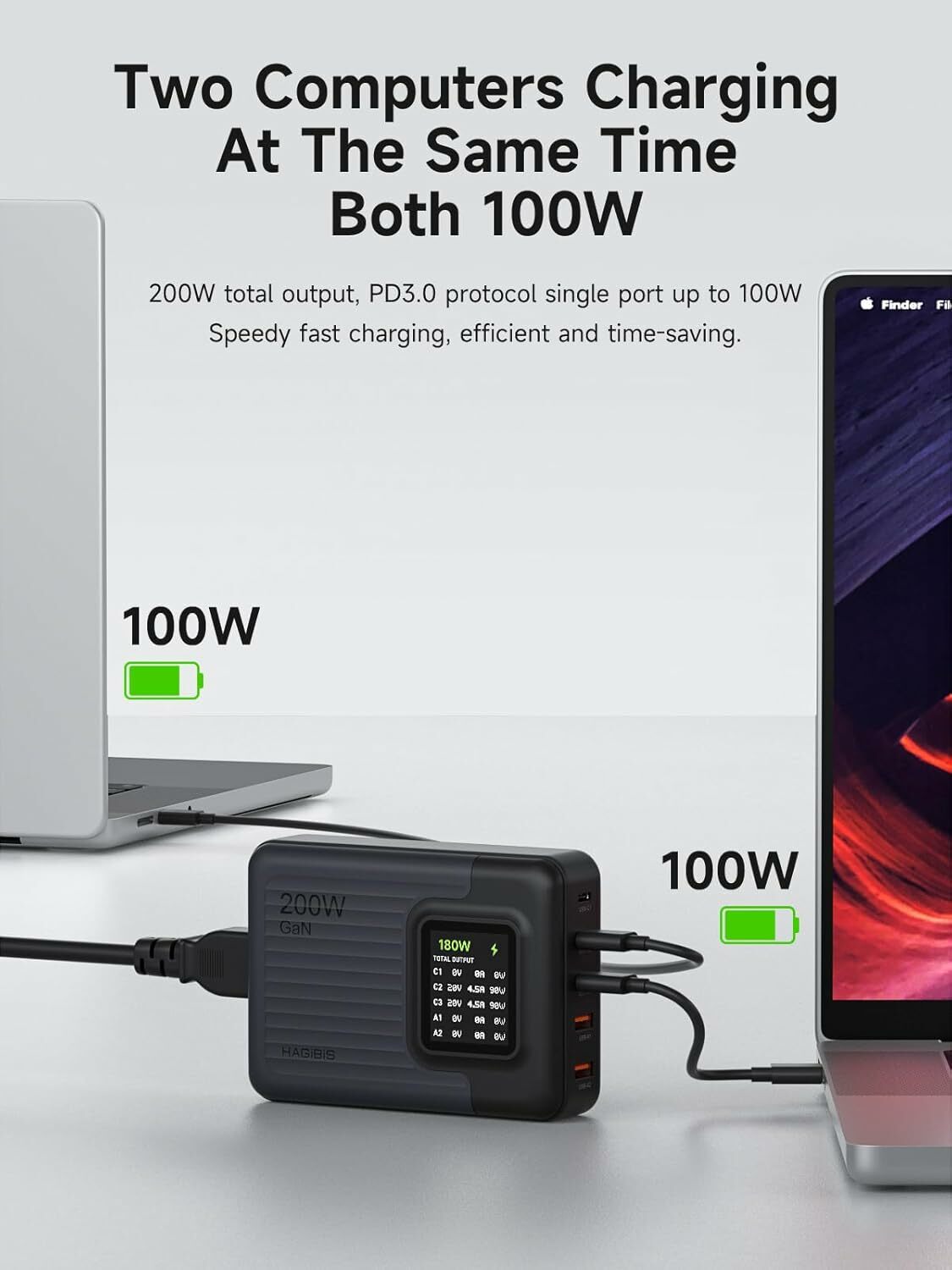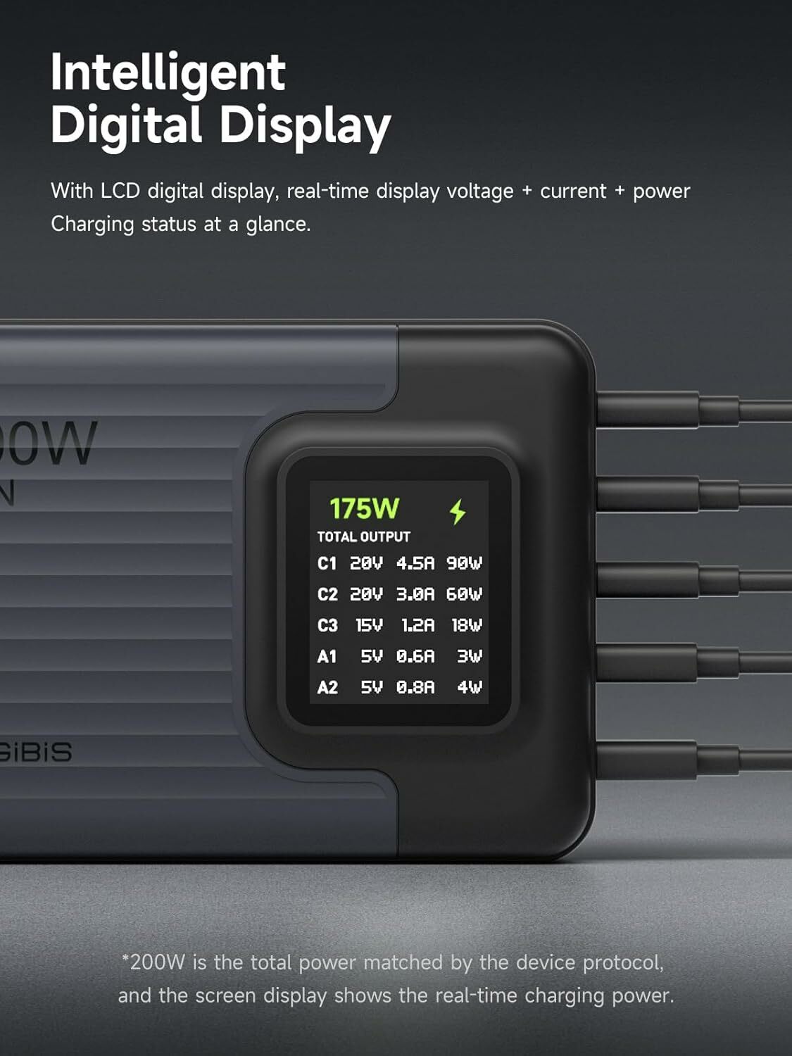 Hagibis 200W GaN充電器配備3個USB-C端口和2個USB-A端口,可同時為多達5個設備充電,支援多種快速充電協議。採用先進的GaN技術實現高效能電力轉換,並配有LCD顯示器便於監控充電狀態,確保安全性並相容於多種設備。