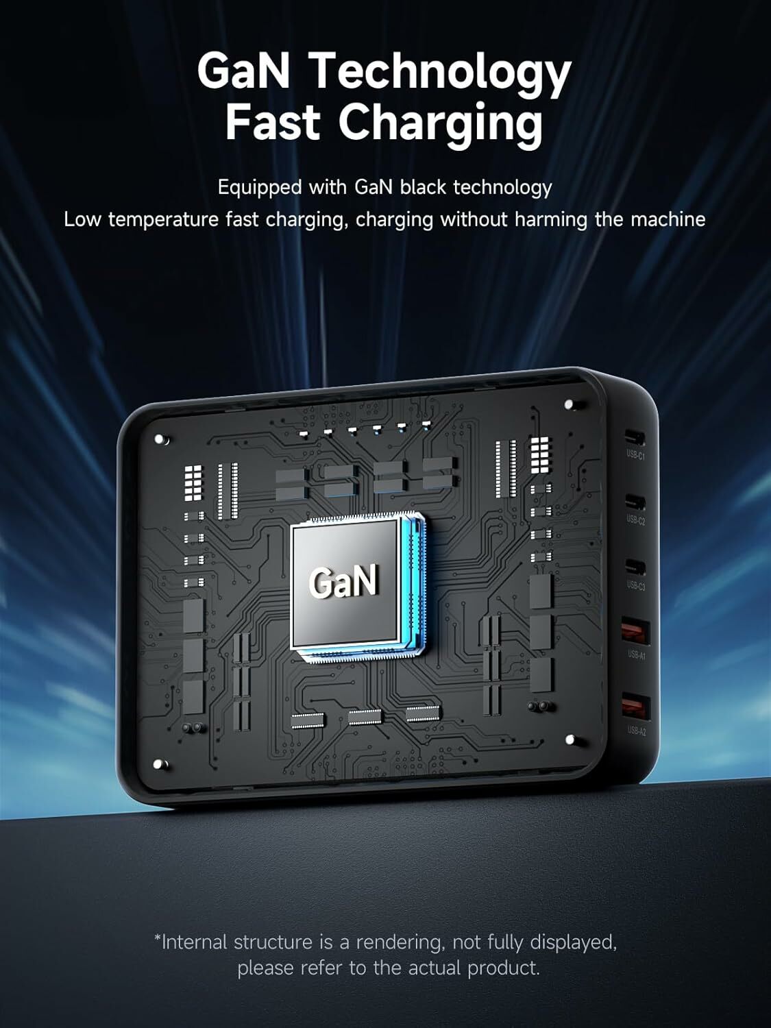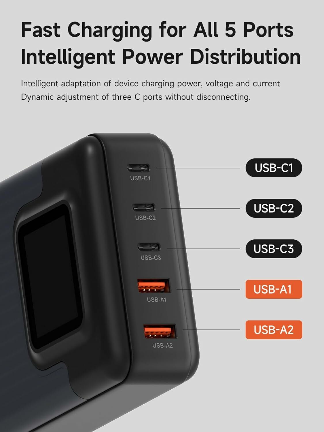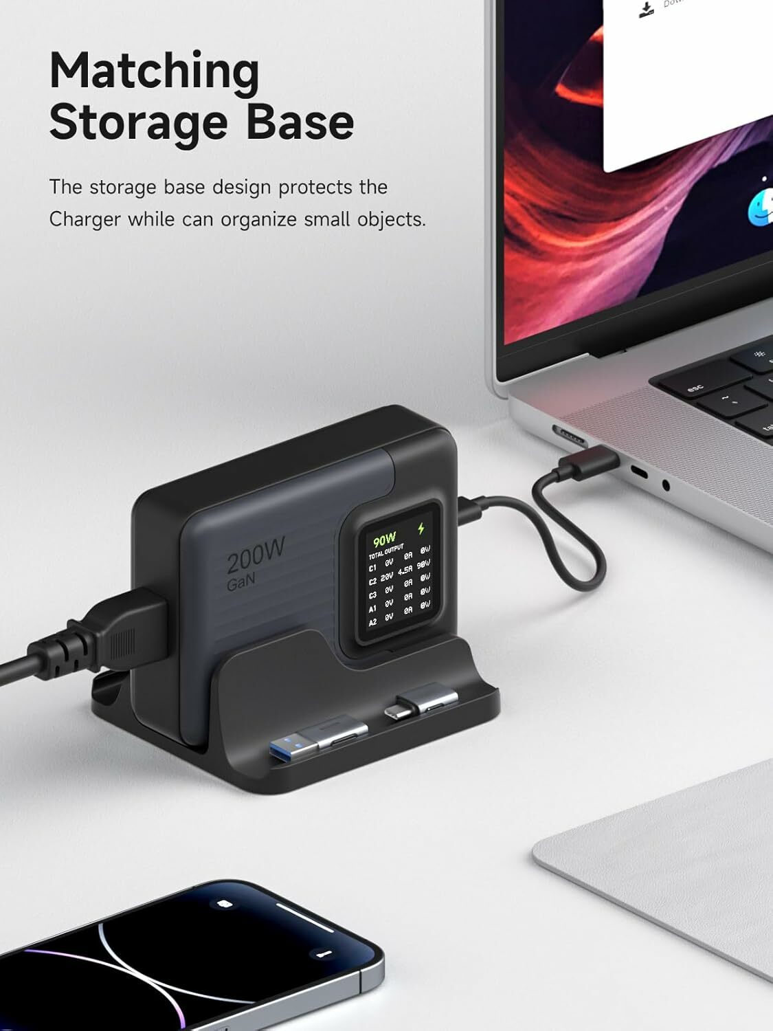 Hagibis 200W GaN充電器配備3個USB-C端口和2個USB-A端口,可同時為多達5個設備充電,支援多種快速充電協議。採用先進的GaN技術實現高效能電力轉換,並配有LCD顯示器便於監控充電狀態,確保安全性並相容於多種設備。