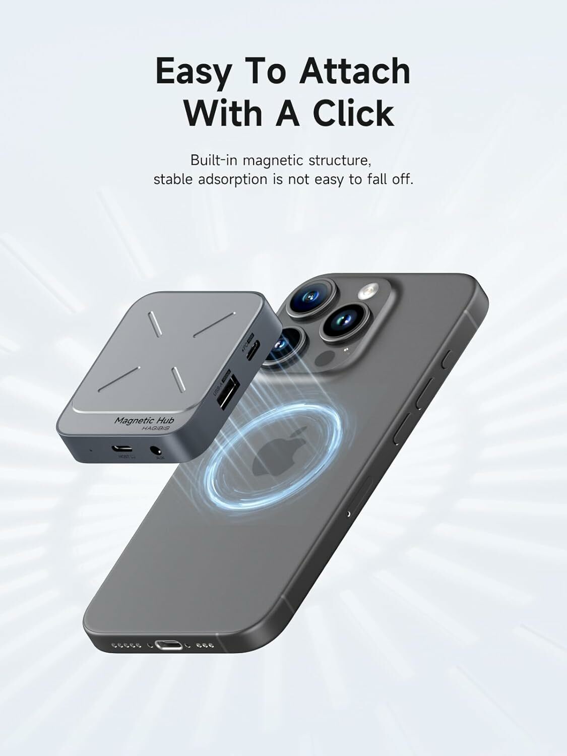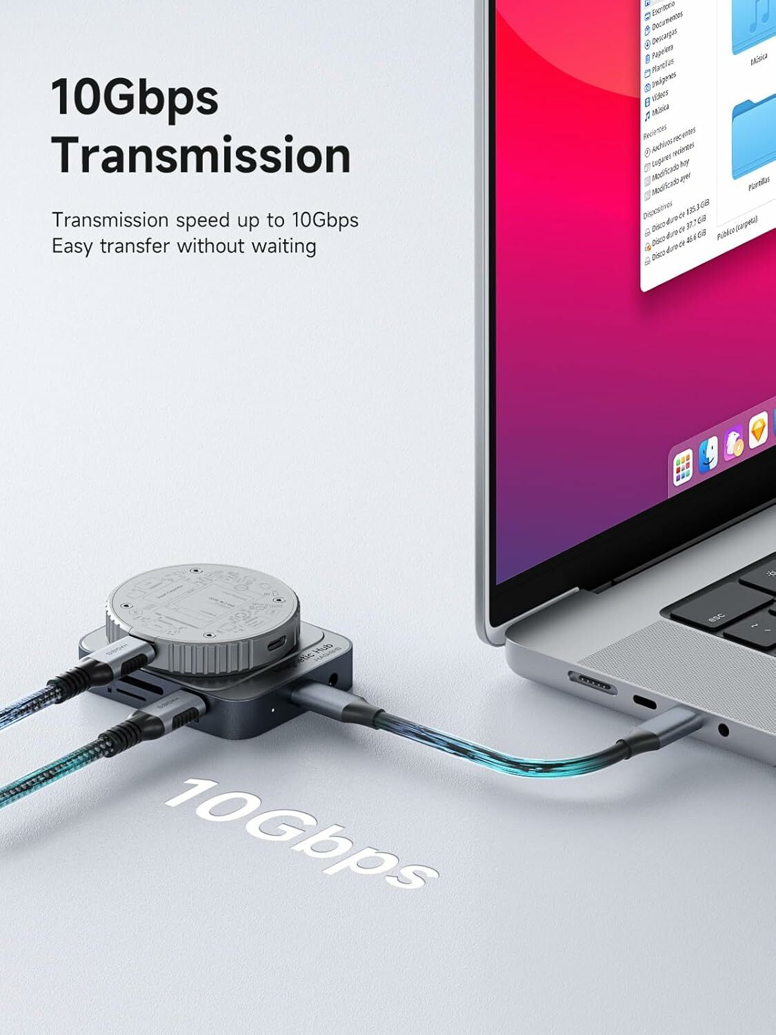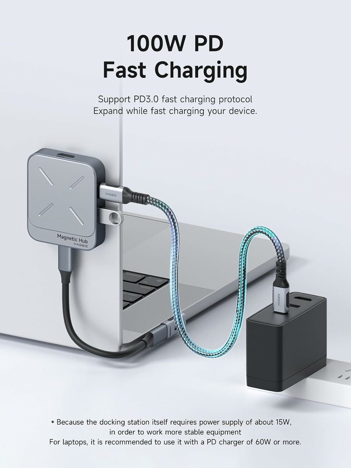 Hagibis 7合1磁性USB-C集線器是一款多功能解決方案,配備100W電源傳輸端口、4K@60Hz HDMI、SD和Micro SD卡讀卡器以及10Gbps USB端口,設計穩固。它支援相容iPhone的ProRes視訊直接存儲,同時支援快速充電和高速資料傳輸。