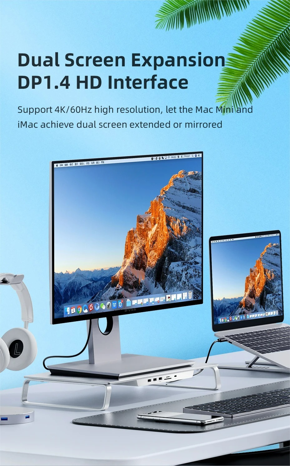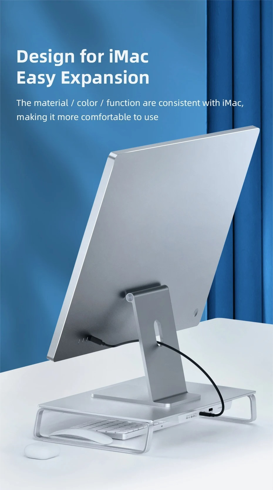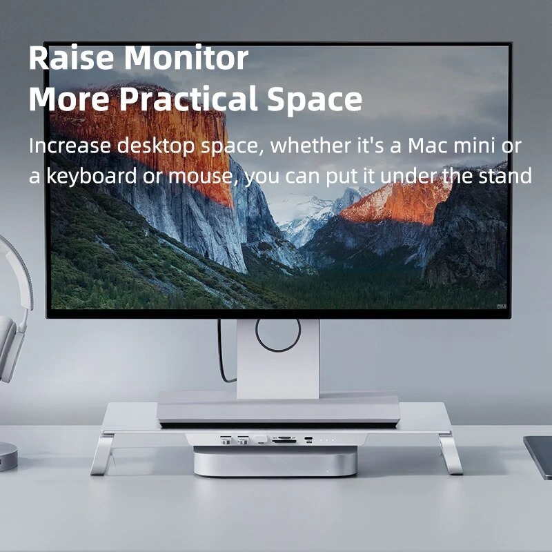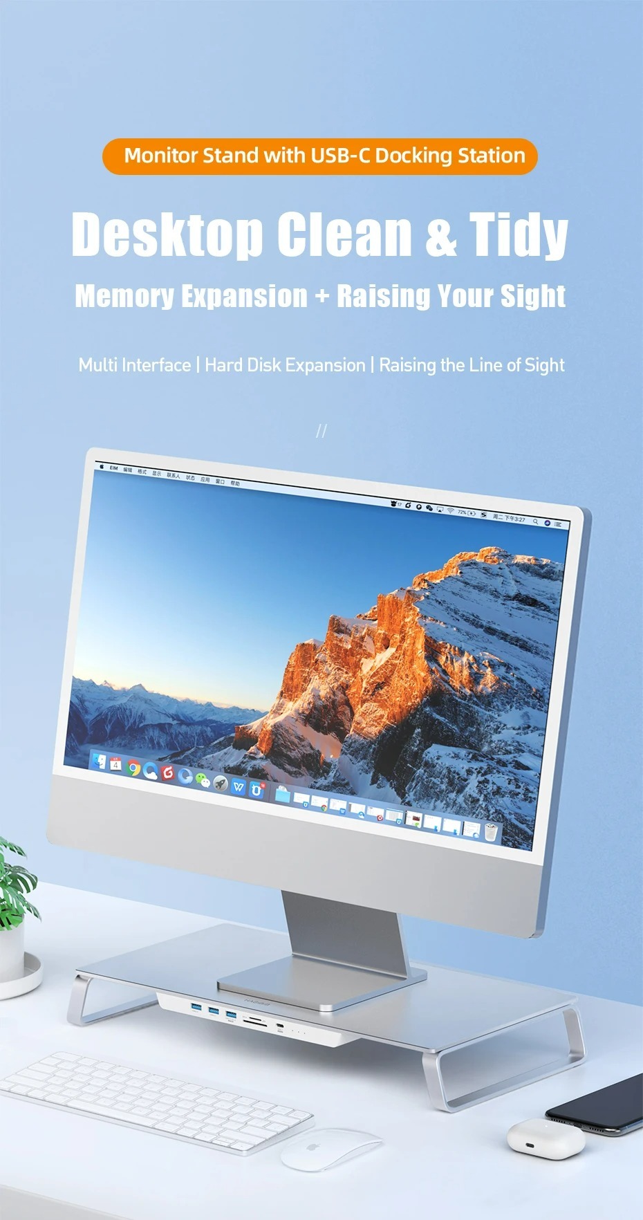 Hagibis三合一螢幕支架不僅能抬高顯示器,還整合多種接口擴充功能(USB 3.1 Gen2/DP 1.4/SD讀卡槽)與雙硬碟倉(2.5吋SATA/M.2 NVMe),同時提供符合人體工學的舒適視角與桌面收納空間。