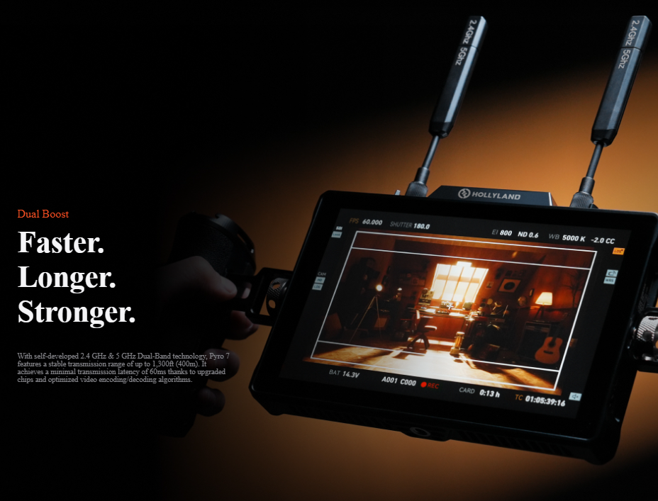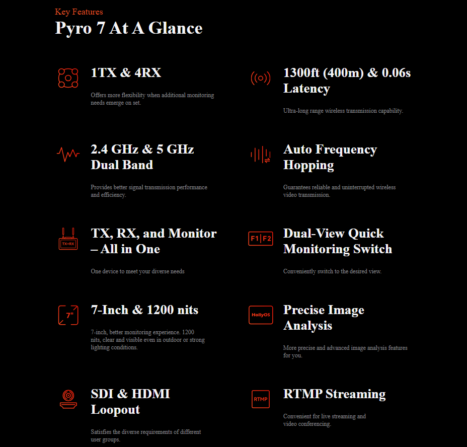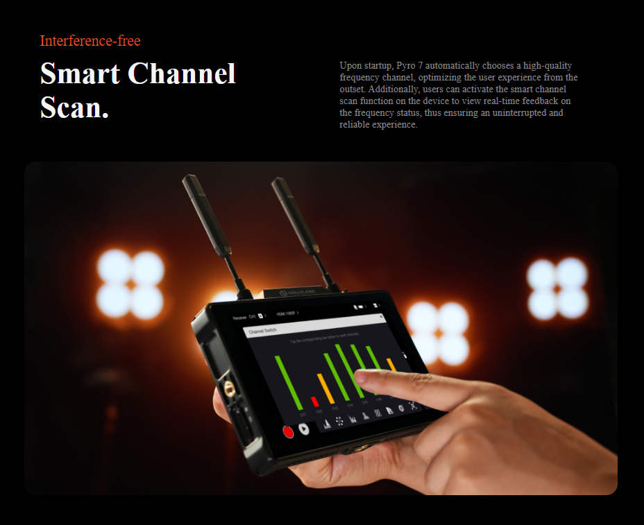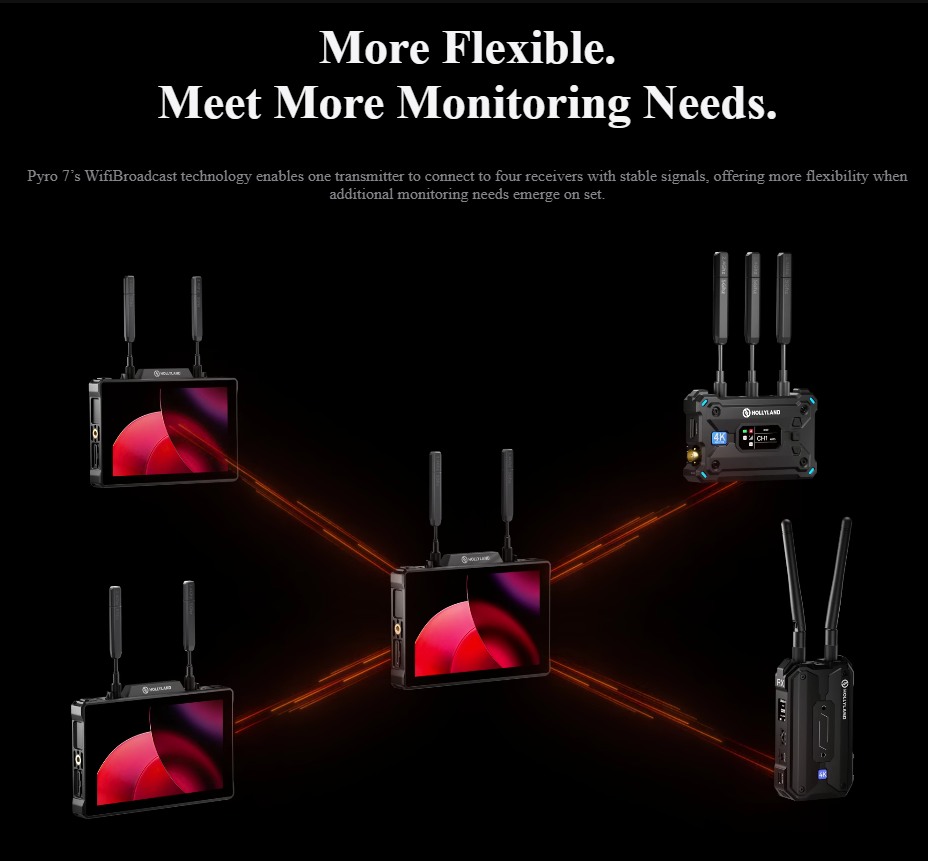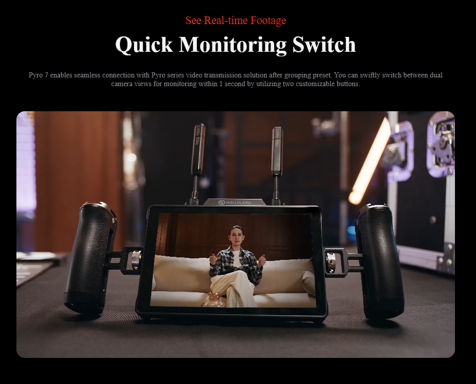 Transmit, receive, and monitor high-quality wireless video transmissions using versatile Pyro 7 Wireless Transceiver Monitor from Hollyland.
