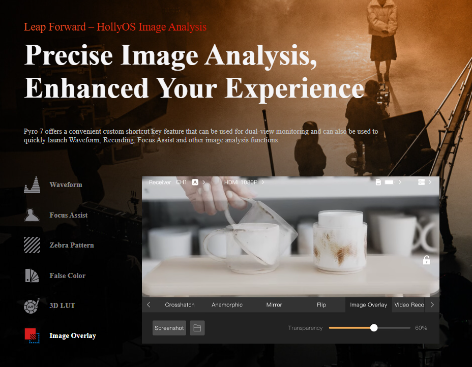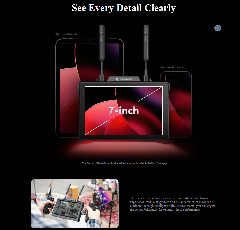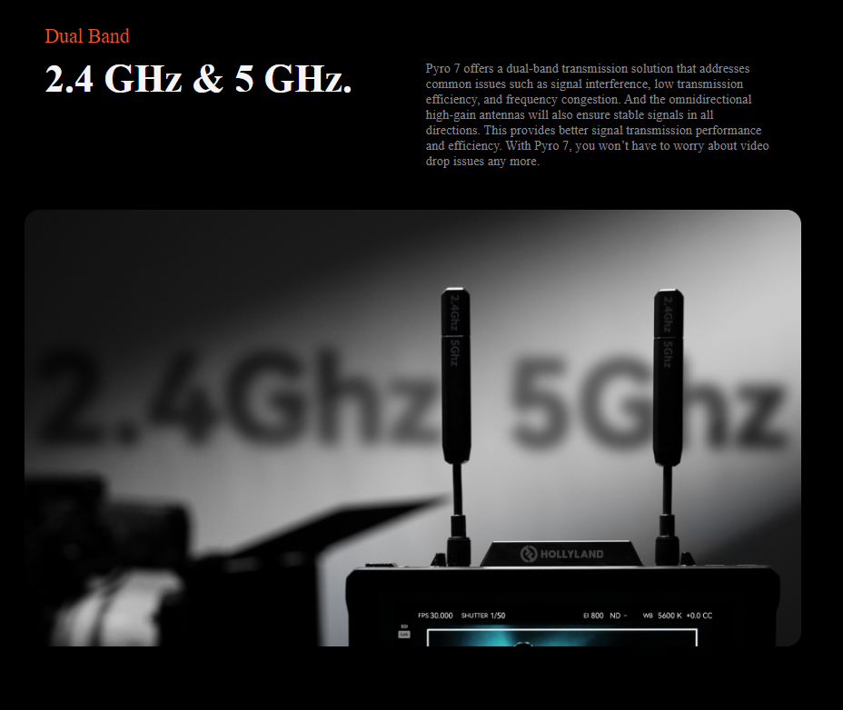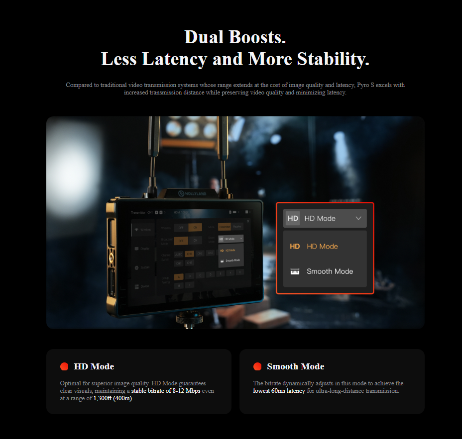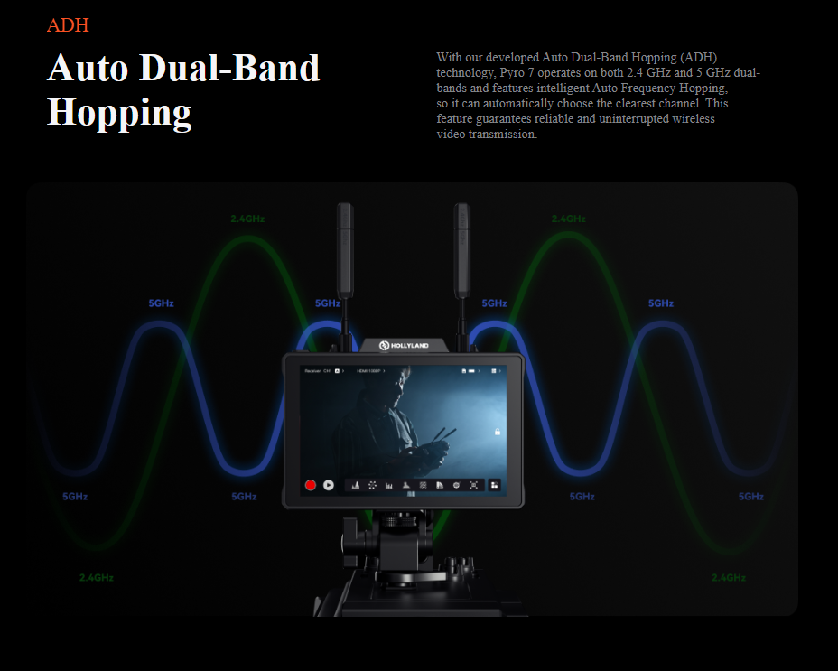 Transmit, receive, and monitor high-quality wireless video transmissions using versatile Pyro 7 Wireless Transceiver Monitor from Hollyland.