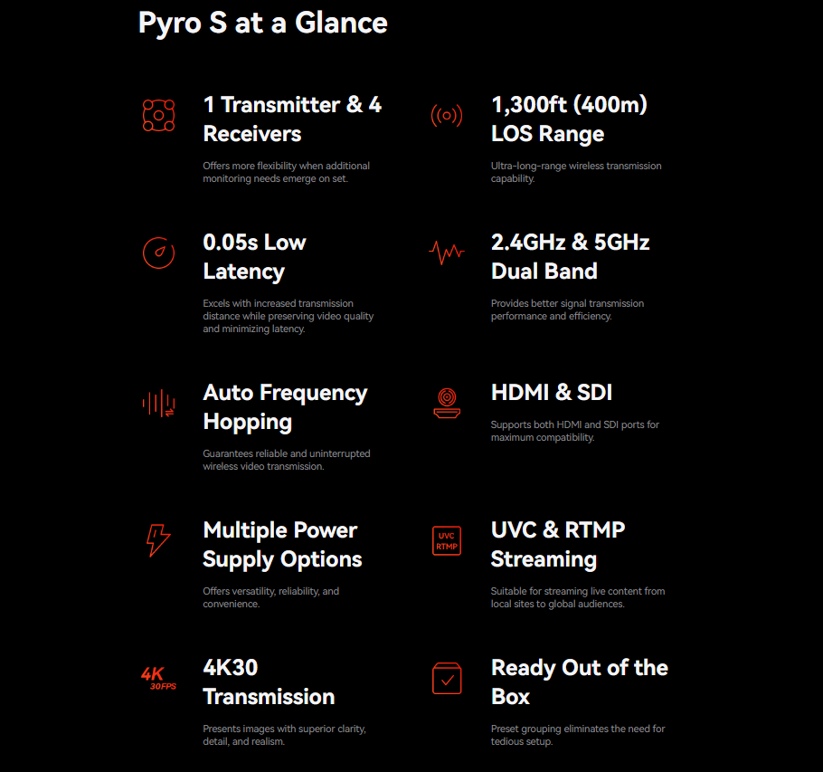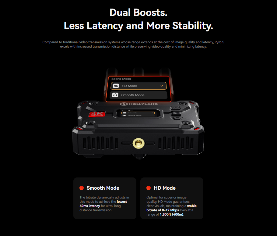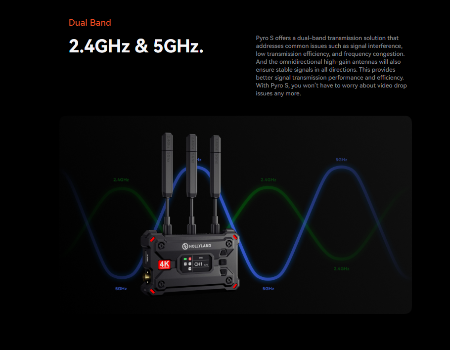 Pyro S is a groundbreaking addition to the Hollyland Pyro series lineup, which redefines wireless video transmission. Pyro S supports HDMI and SDI input/output and can transmit to up to four receivers simultaneously, with a range of up to 1,300ft (400m) and minimal latency of just 50ms. Pyro S uses advanced Auto Dual-Band Hopping (ADH) technology to ensure reliable transmission and features selectable modes for your real-world shooting needs. Lighter and more durable than traditional models, Pyro S's magnesium alloy shell makes it easier to carry and handle. It's ideal for multi-user monitoring in dynamic shooting scenarios, such as film production, live events, and ENG/EFP applications.