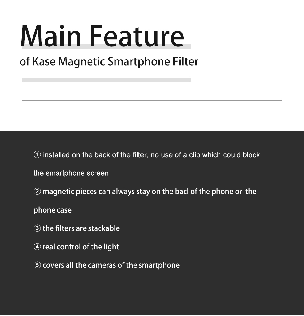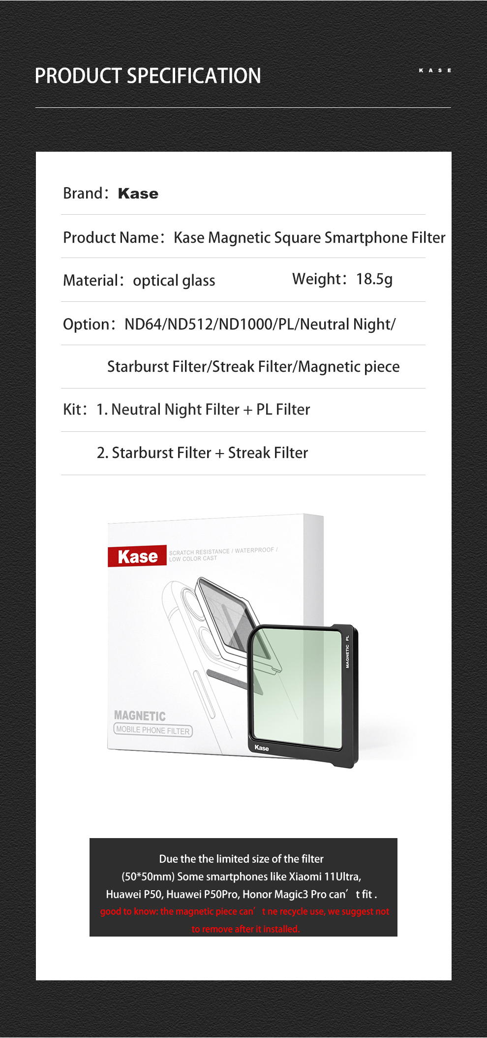 • 【手機磁性方形過濾器】Kase Square 中性夜/光污染過濾器專為大多數智慧型手機設計。這款方形過濾器採用磁力設計,可讓您快速將方形過濾器安裝在手機或手機保護套背面。