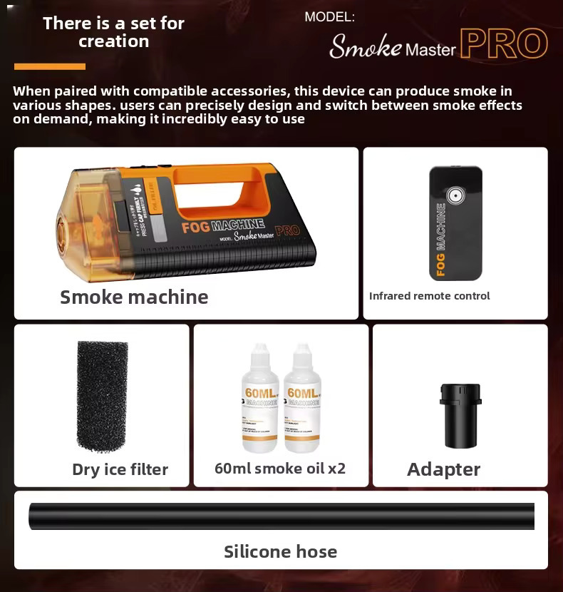 Infrared Remote Control、Fog Liquid Bottles、Silicone Hose、Power Adapter