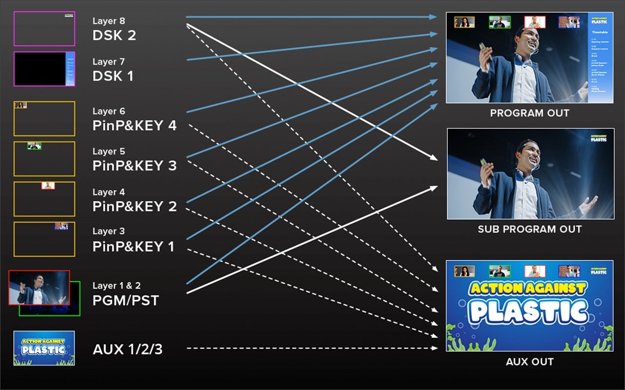 ✓ 圖層可分配至主節目、子節目及三組輔助輸出
