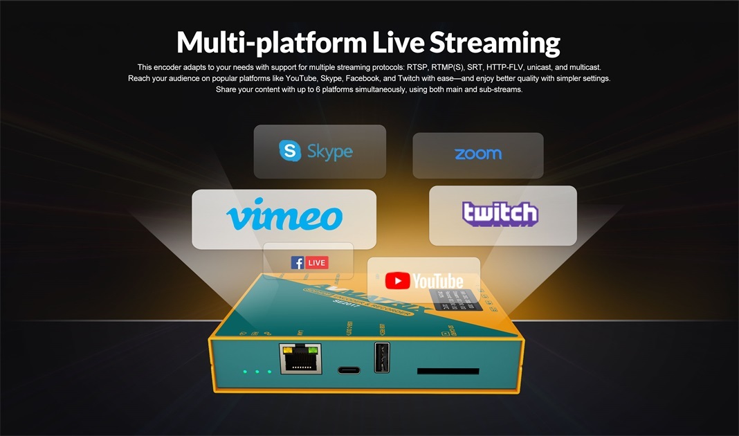 • 多種串流協定:HTTP、RTSP、RTMP、RTP、UDP、多播、單播、SRT