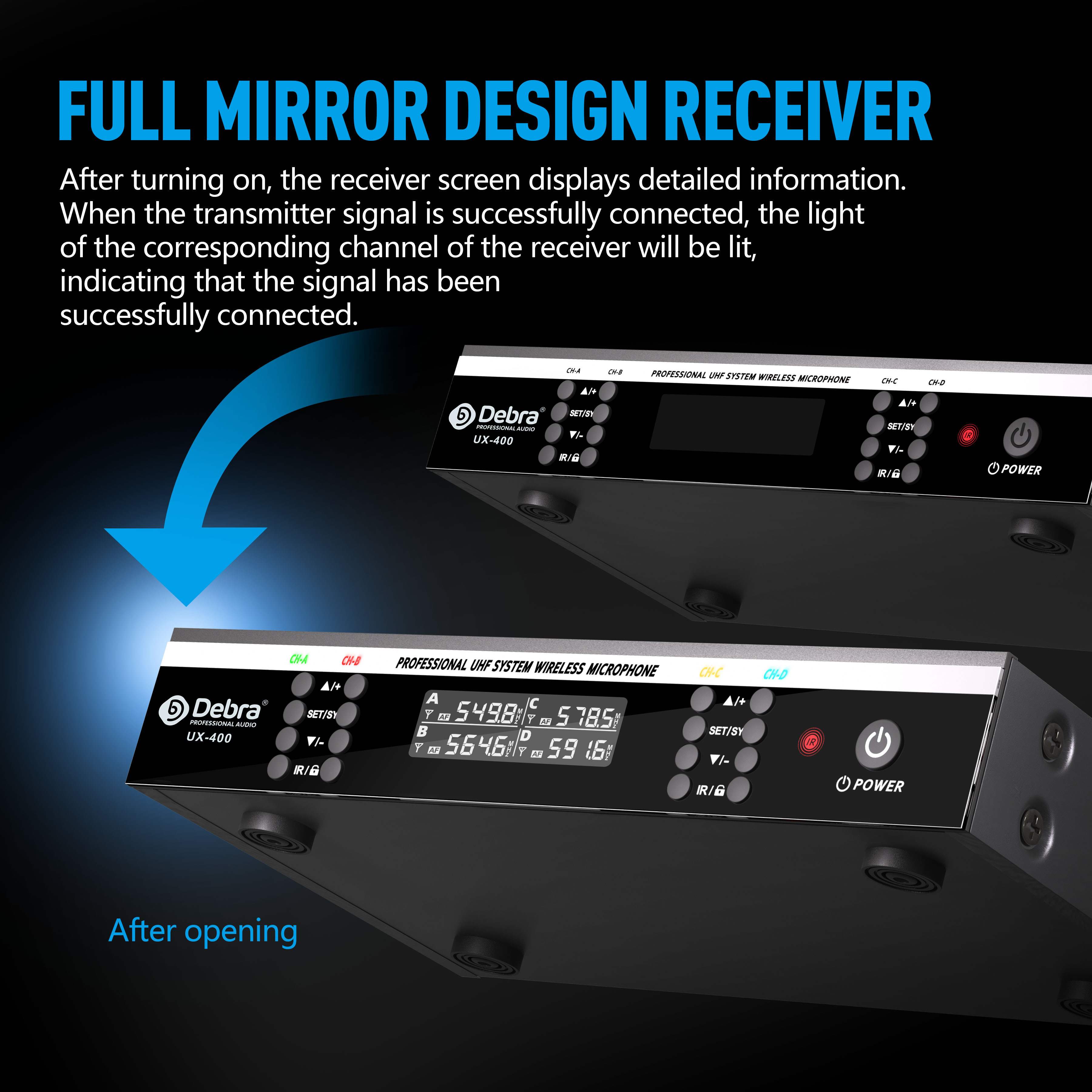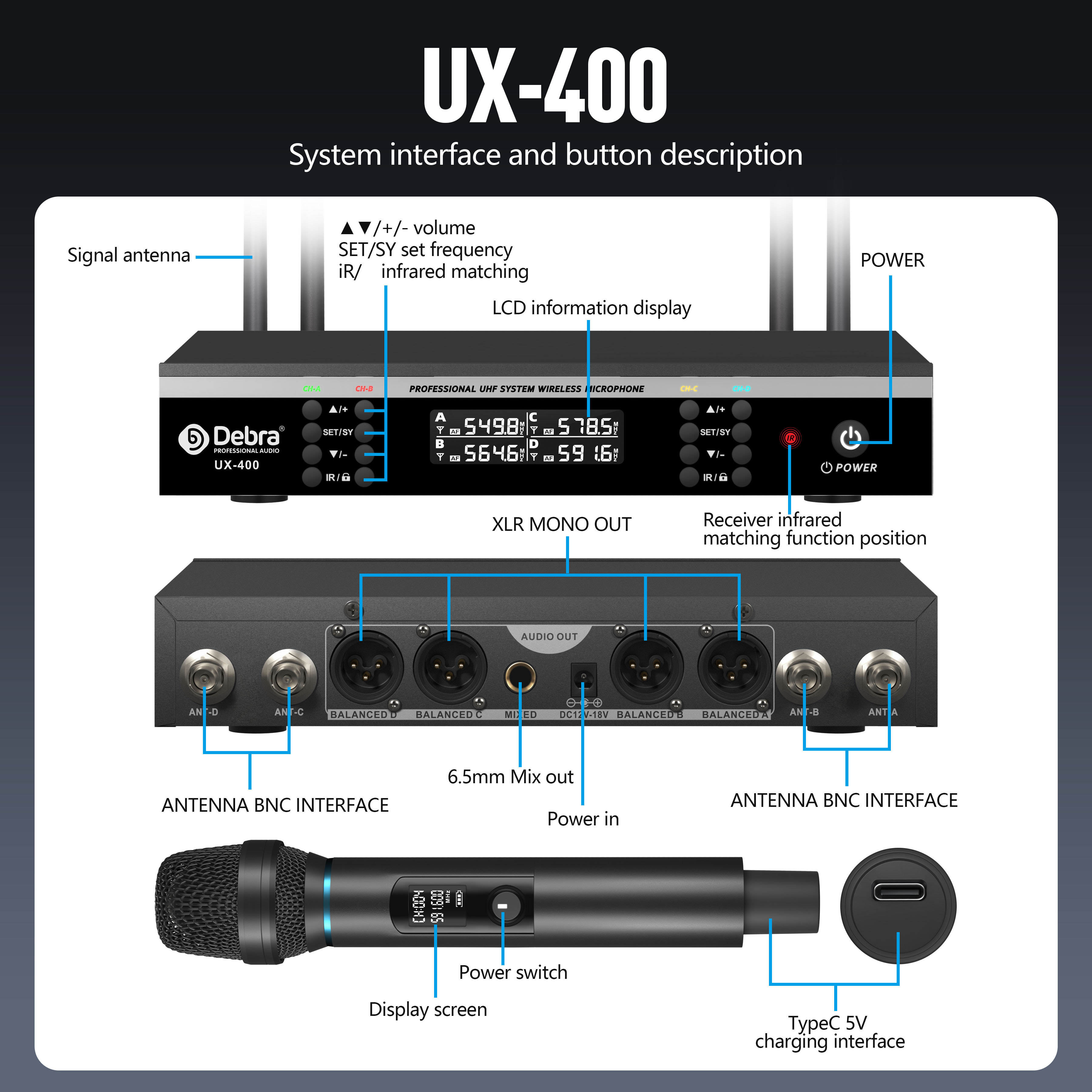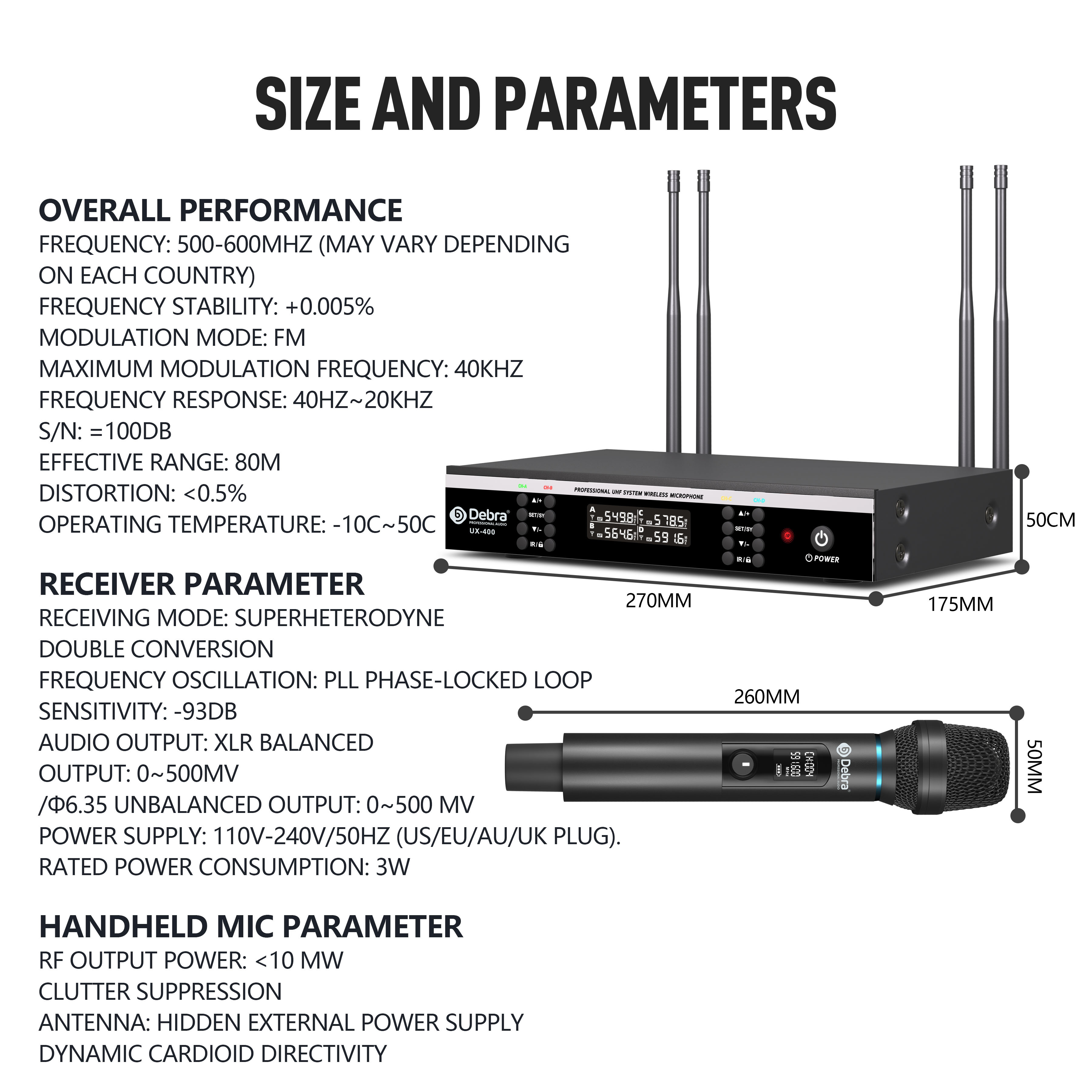 這款無線麥克風使用 UHF 信號傳輸。手持麥克風發射器和接收器均採用金屬材質,增強了耐用性。重新設計的電路和高品質晶片優化了聲音信號的傳輸,並顯著減少無線傳輸過程中的音質損失。該系統的穩定傳輸範圍為80米,在開闊區域且無信號干擾的情況下可達到100米。多功能接收器內置的SYNC自動頻率搜索功能,可以在複雜環境中自動掃描並定位安全頻率,以避免信號干擾。發射器可通過紅外匹配快速配對。這款無線麥克風擁有非常高的音質還原度,非常適合在家庭聚會上唱歌、進行會議演講,甚至是舞台表演。