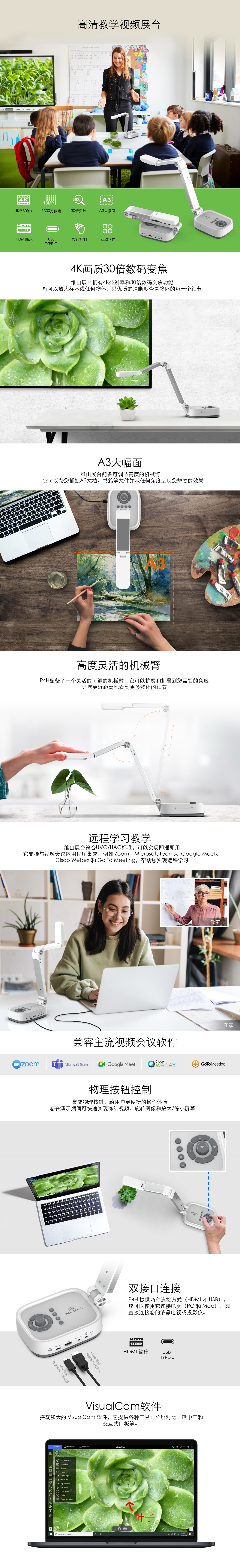 P4H 是一款4K高清教學視訊展位,配備1300萬像素相機可以實現4K、30fps以及30X數位變焦功能,它可以幫助教師展示每一個細節,無論是演示頁面、一本書,或顯示一個標本的模型 。 可折疊機械手臂可以輕鬆折疊產品並存放在您攜帶的背包裡,非常方便老師隨身攜帶設備,隨時隨地進行教學、錄音、 直播或課程規劃。